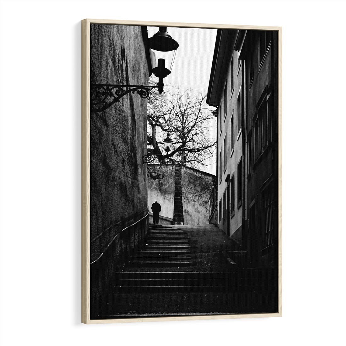 Obraz w ramie 80x120 - Ukryta Uliczka - czarno białe zdjęcie, schody - rama drewno