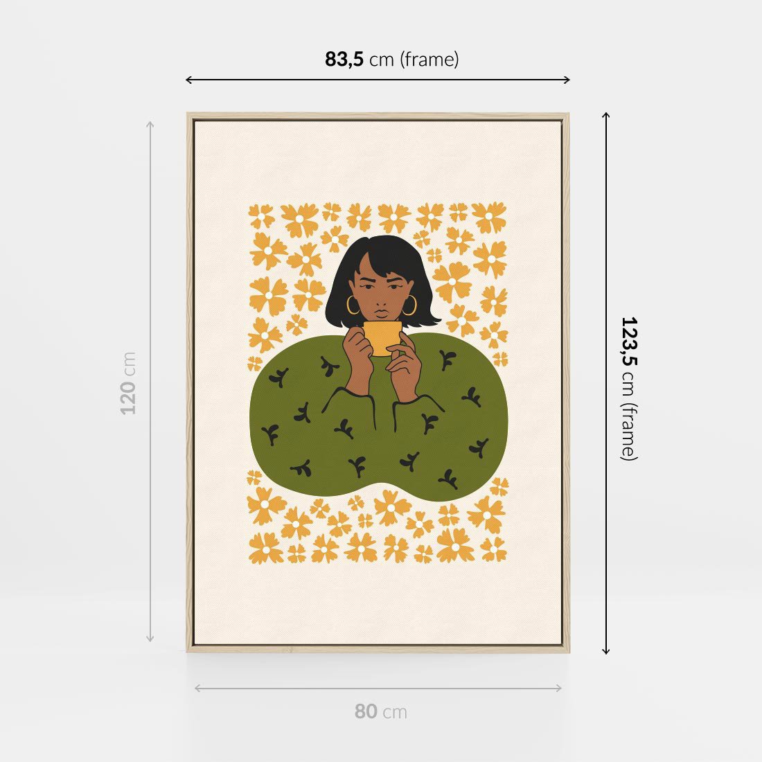 Obraz w ramie 80x120 - Wewnętrzne Fale - nowoczesny plakat, kobieta otoczona liśćmi - rama drewno