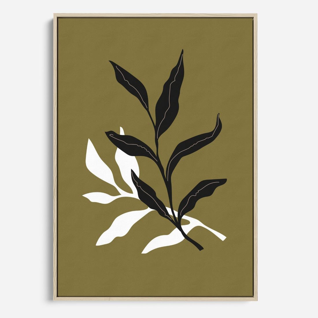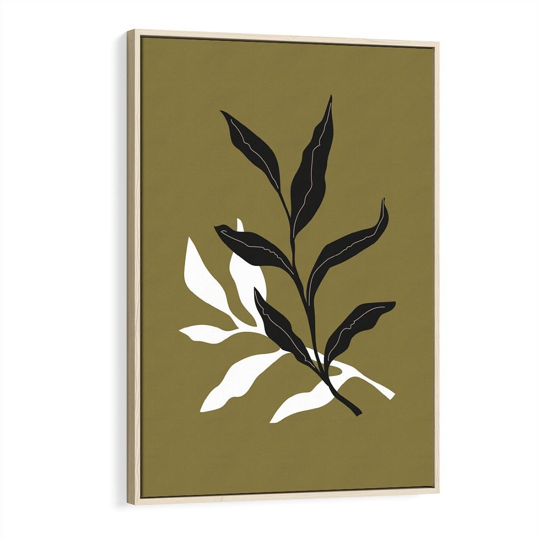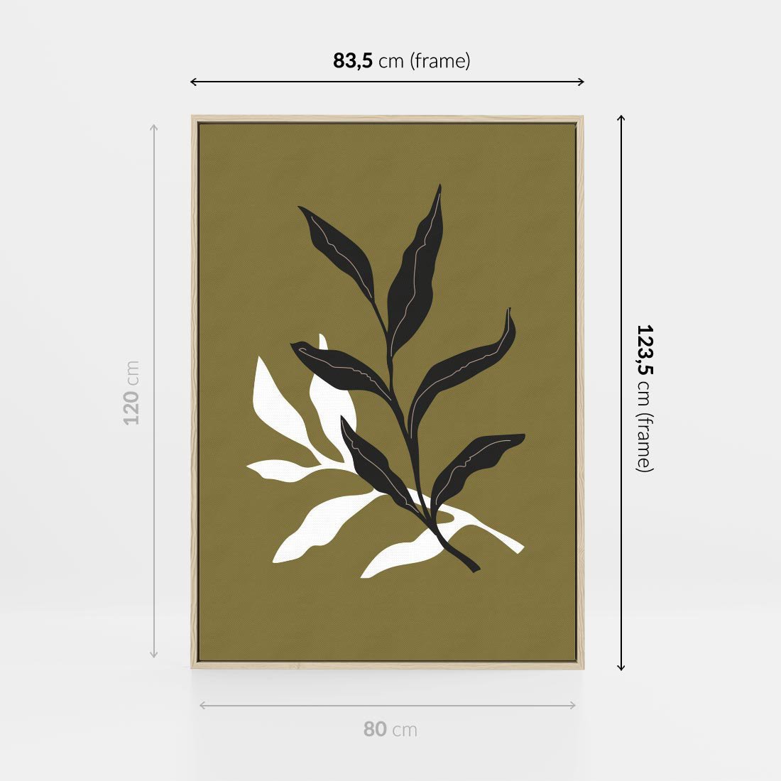 Ten plakat ukazuje liście i gałązki w minimalistycznym stylu na oliwkowym tle, w kontrastujących odcieniach bieli i czerni. Sztuka ta oddaje spokój i równowagę natury, tworząc jednocześnie elegancki i wyrafinowany element dekoracyjny, który wnosi harmonię i naturalny urok do Twojej przestrzeni.