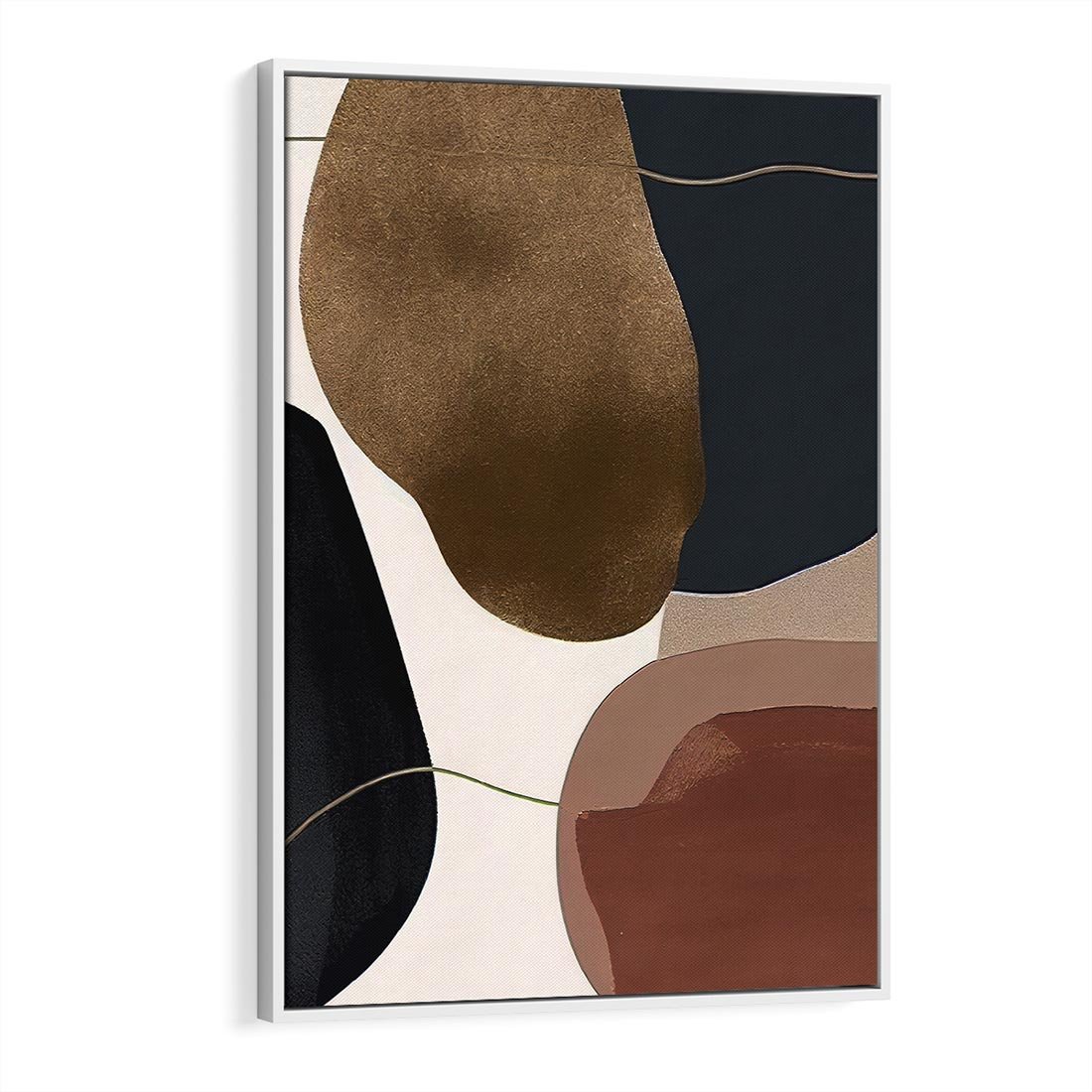 Odkryj abstrakcyjny obraz z nieregularnymi plamami w czarnym, złotym i brązowym na beżowym tle. Złote linie kreski dodają elegancji. Dla miłośników sztuki poszukujących wyjątkowych dzieł do nowoczesnych i klasycznych wnętrz.