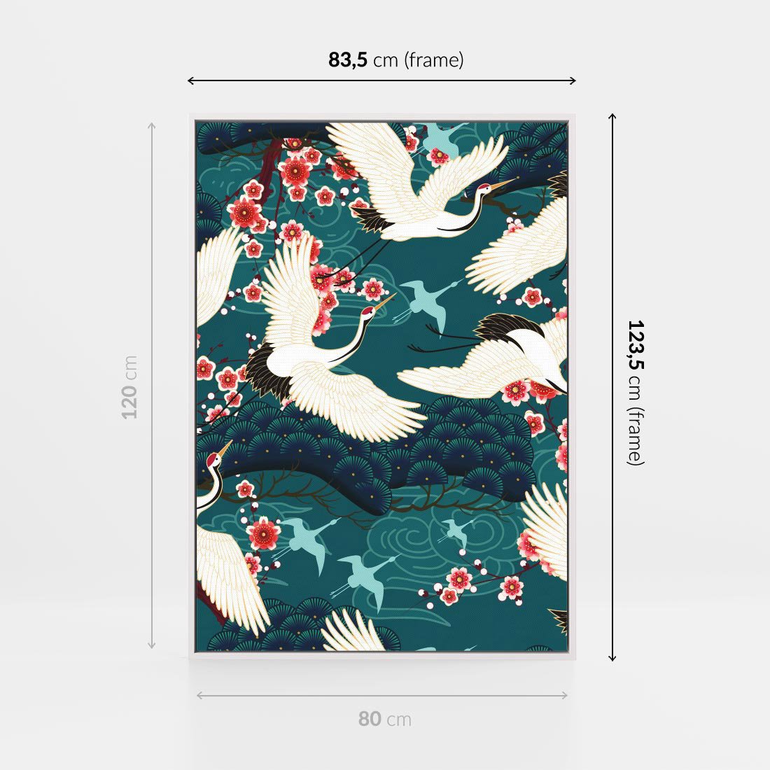Grafika przedstawia orientalne japońskie żurawie lecące na turkusowym tle, w otoczeniu delikatnych kwiatów wiśni. Kształty wachlarzy dodają kompozycji elegancji. To artystyczne dzieło niesie ze sobą odrobinę dalekich kultur, przynosząc spokój i subtelny urok do wnętrza. Doskonałe do dekoracji w każdej przestrzeni.