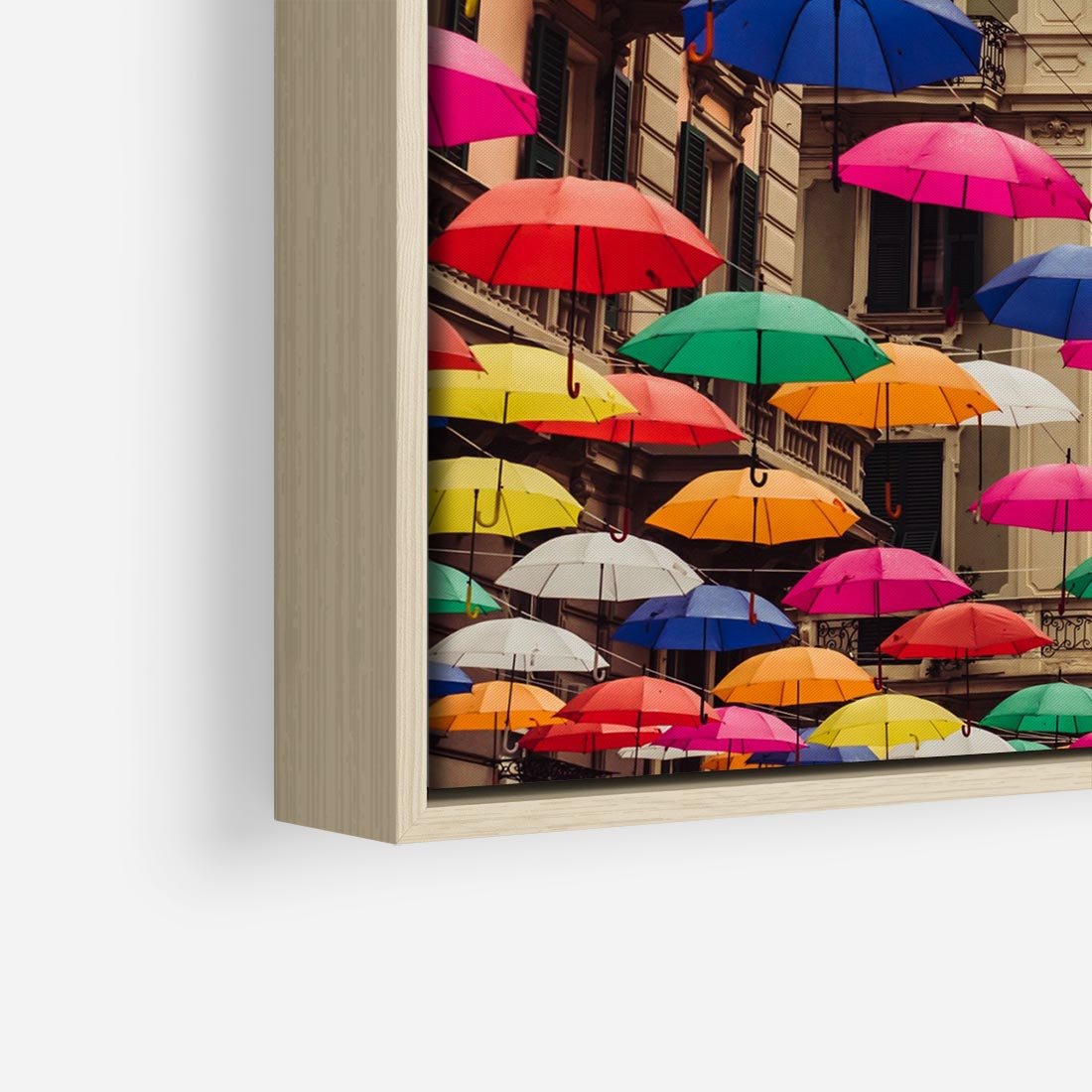 Obraz w ramie 80x80 - Barwna symfonia wyobraźni - fotografia, kolorowe parasolki podwieszone nad ulicą - rama drewno