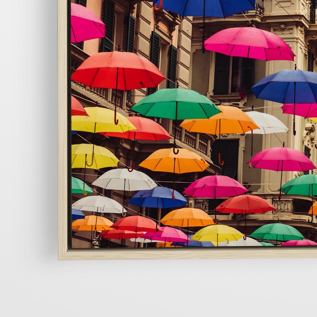 Fotografia ukazująca radosną scenę ulicy, gdzie kolorowe parasolki unoszą się nad głowami przechodniów. Ta tęczowa eksplozja kolorów tworzy niezapomnianą atmosferę, wprowadzając radość i życie do Twojego wnętrza. Te zatrzymane w kadrze chwile przypomną Ci o urokach codziennego życia.