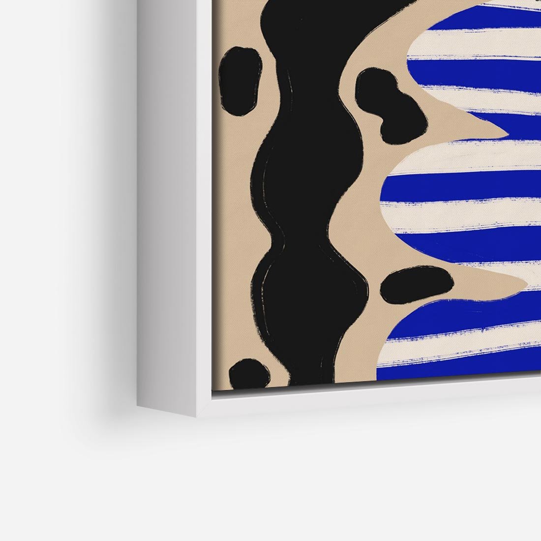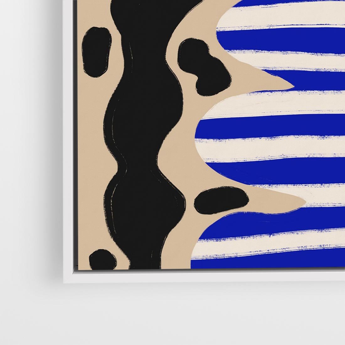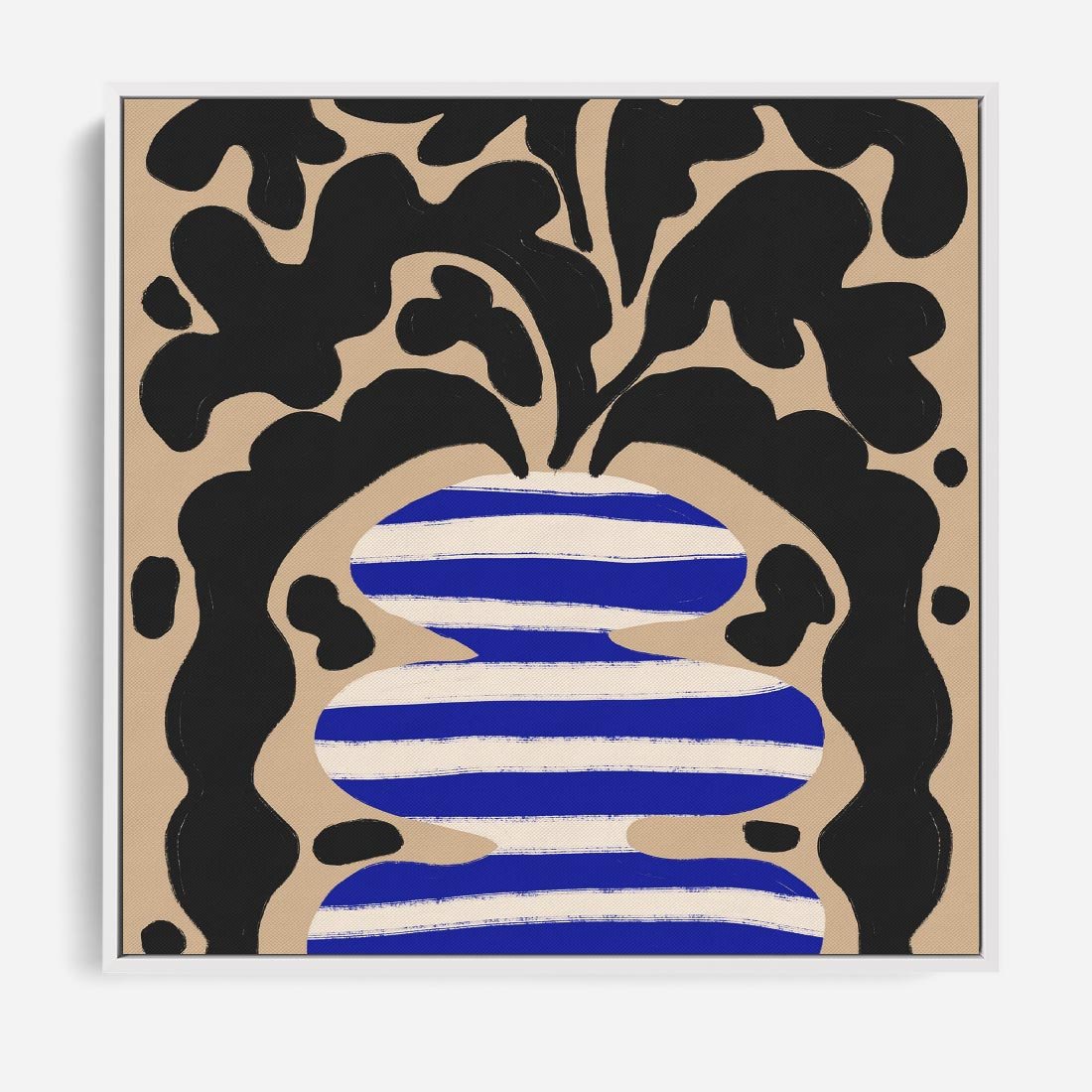 Ten abstrakcyjny plakat prezentuje fascynujące formy, które mogą przypominać wazon w biało-niebieskie pasy, a w nim umieszczone są stylizowane, czarne liście. To wyjątkowy dodatek do każdego wnętrza.