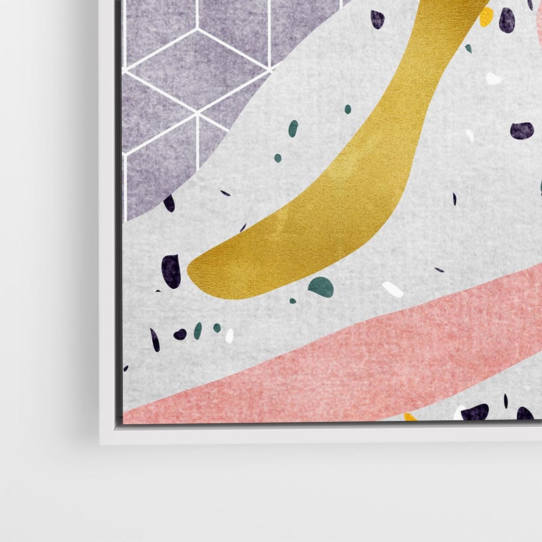 Ten kolaż tekstur łączy pastelowe abstrakcyjne plamy z elementami lastryko, tworząc mistyczną atmosferę. Przenosi nas w abstrakcyjny świat, w którym różne tekstury i kształty oplatają się, pozwalając nam zanurzyć się w niepowtarzalnej podróży przez nieodkryte przestrzenie wyobraźni.