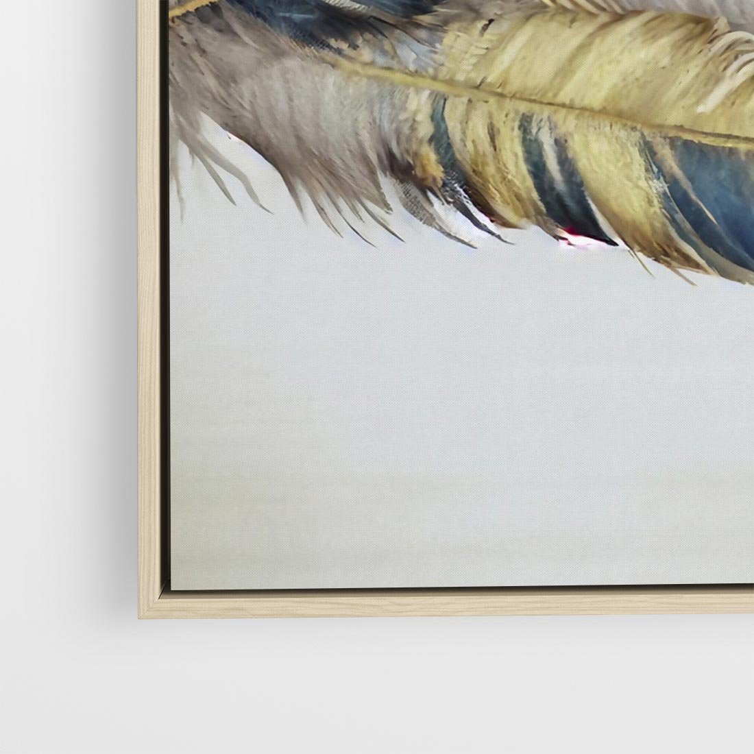 Ten unikatowy obraz przedstawia granatowe i złote pióra w stylu boho. Sztuka ta emanuje swobodą i egzotycznym wdziękiem, przyciągając wzrok swoją oryginalnością. Wyraziste kolory i piękno piór wkomponowane w dzieło sztuki dodają przestrzeni wyjątkowego charakteru i artystycznego stylu, idealnego dla miłośników boho.