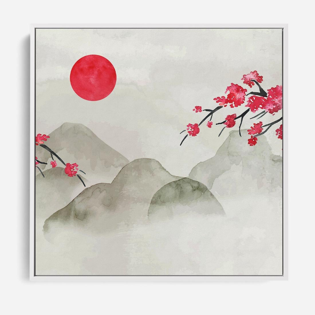 To malownicze dzieło sztuki w stylu Japandi ukazuje górski krajobraz Japonii z kwitnącą wiśnią pod czerwonym zachodzącym słońcem. Kompozycja emanuje harmonią i spokojem, charakterystycznym dla stylu Japandi. Połączenie natury, zachodu słońca i kwitnących wiśni tworzy wyjątkową atmosferę, która przenosi nas w spokojny świat natury.
