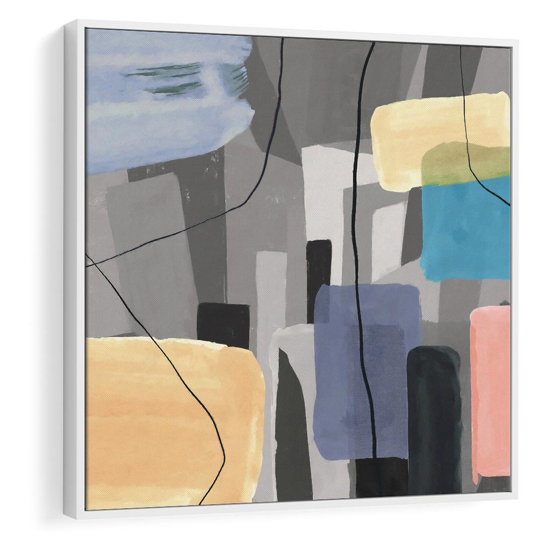 Obraz w ramie 80x80 - Harmonia w chaosie serca - abstrakcja na szarym tle, kolorowe plamy koloru - rama biała