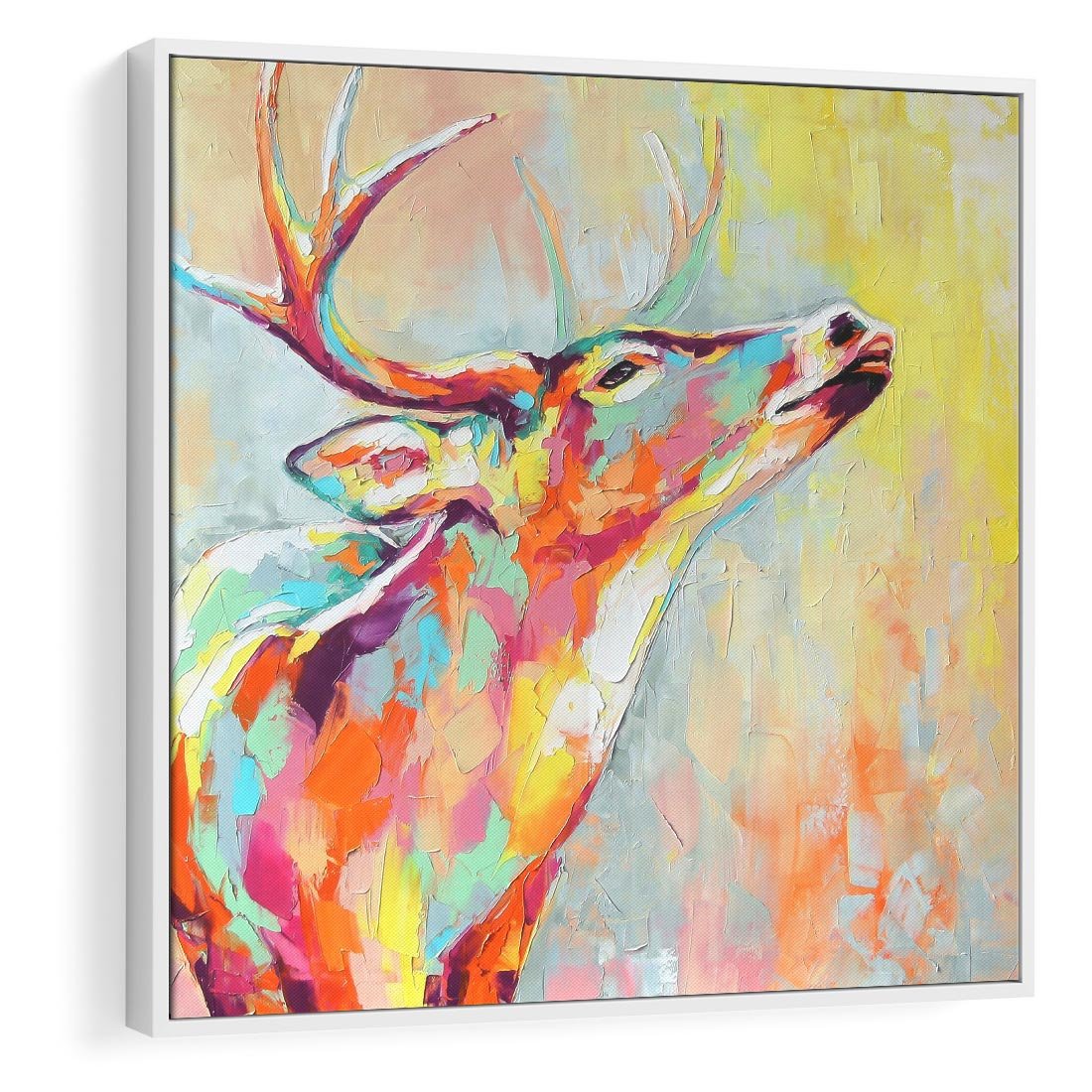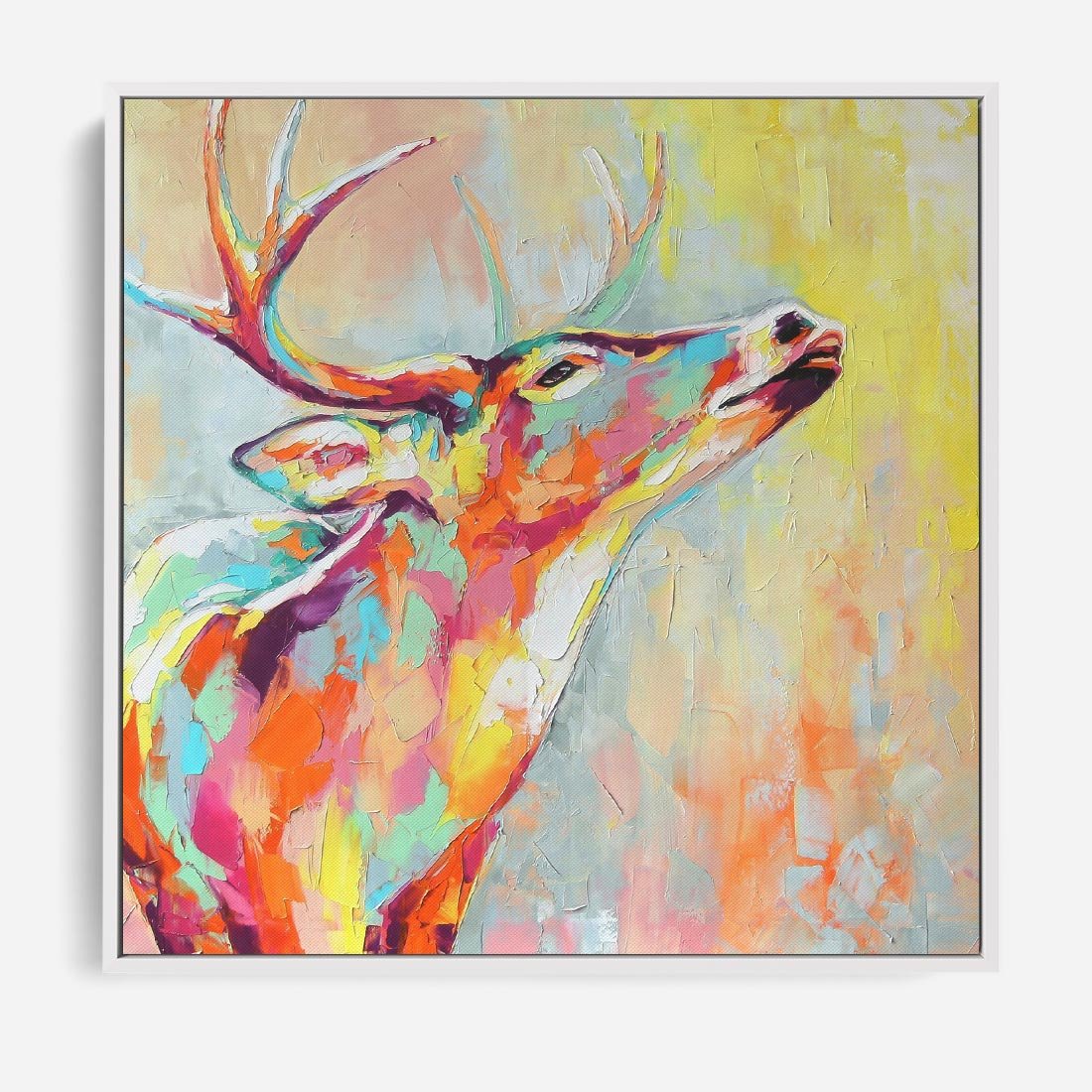 Obraz w ramie 80x80 - Impresje snów malarza - kolorowy olejny obraz, jeleń ryczący na rykowisku - rama biała