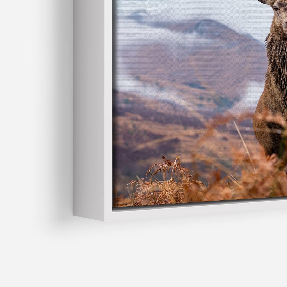 Obraz w ramie 80x80 - Jeleń w Uśpionym Krajobrazie - jeleń na tle gór, ośnieżone góry - rama biała