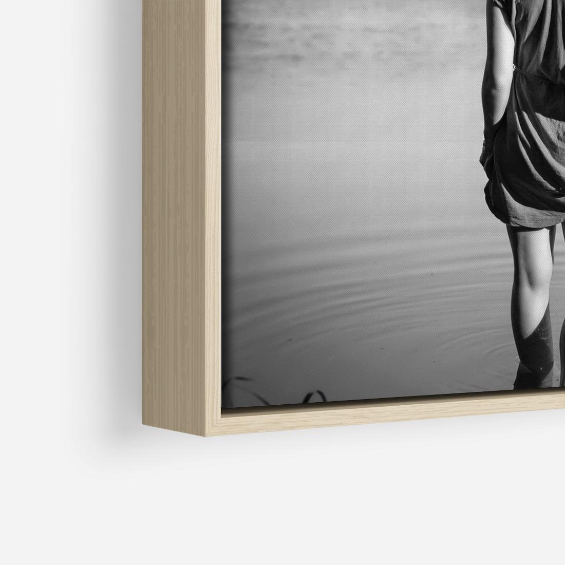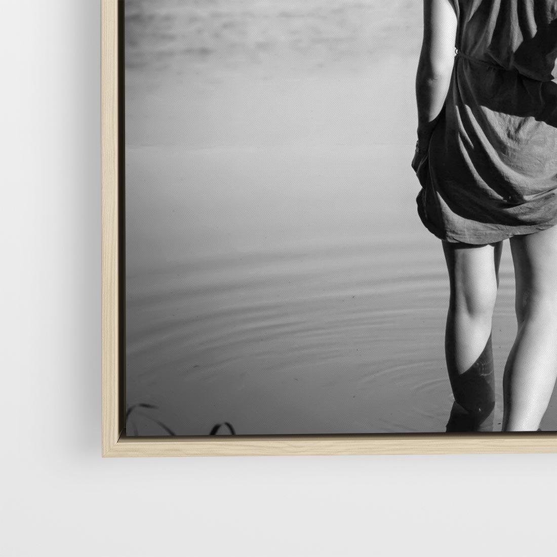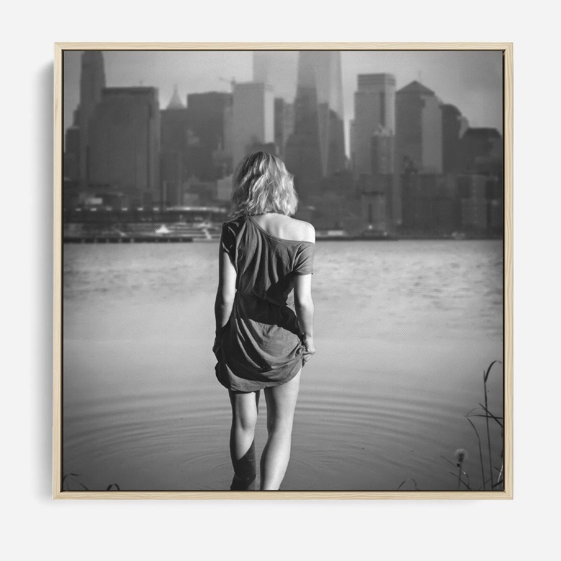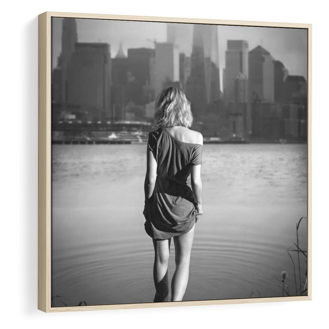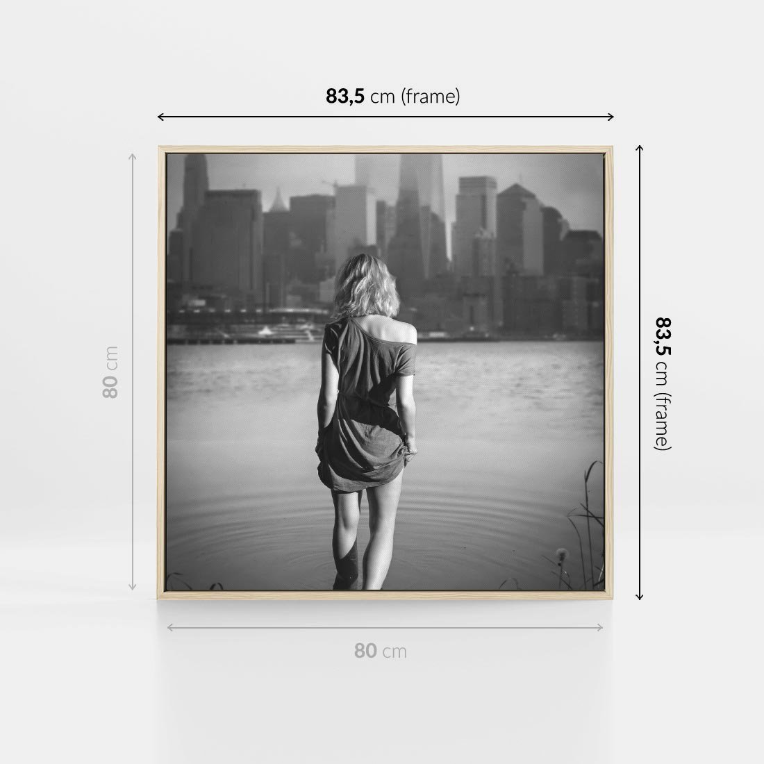 Obraz w ramie 80x80 - Kapiel w Mieście - czarno białe zdjęcie, kobieta wchodzi do wody - rama drewno