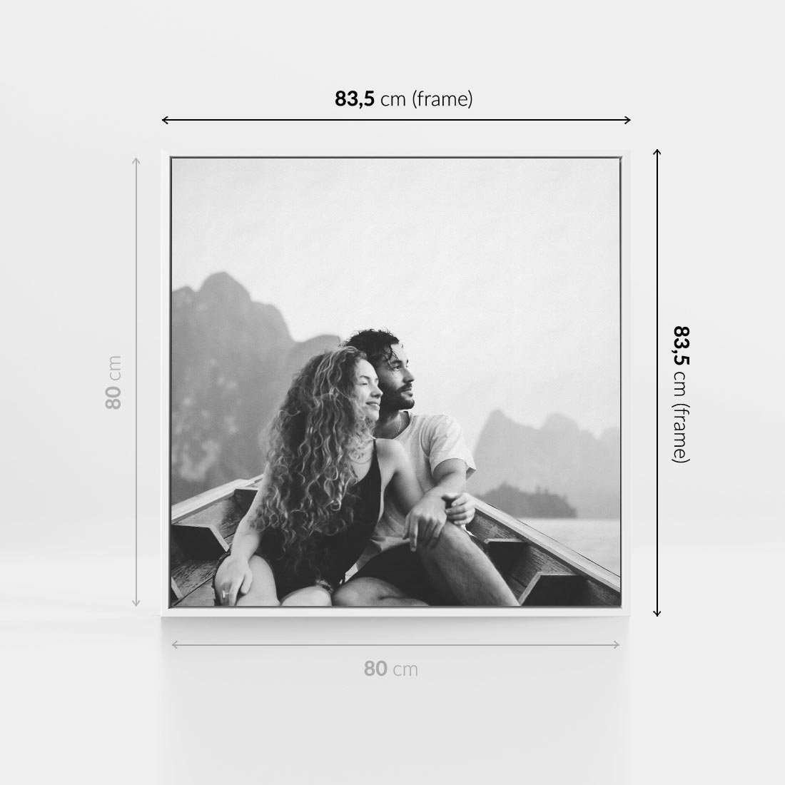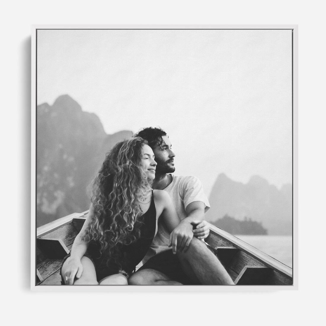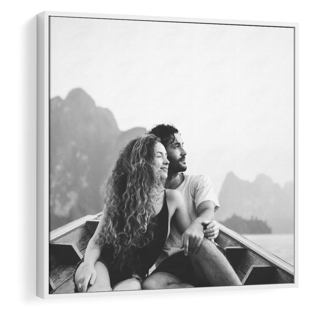 Obraz w ramie 80x80 - Księga mglistych marzeń - czarno biała fotografia, para zakochanych w łodzi - rama biała