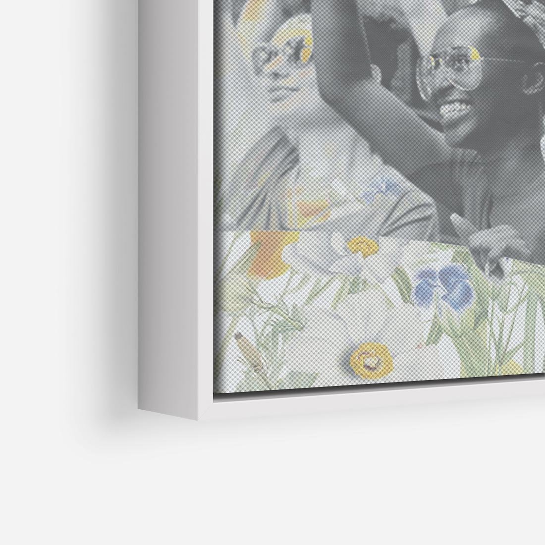 Zapraszamy do odkrycia tego wyjątkowego kolażu, który ukazuje czarno-białe zdjęcie wesołych młodych ludzi, otoczonych tłem z kwiatów retro. Doskonały akcent dla tych, którzy pragną wprowadzić do swoich wnętrz unikalny i radosny wyraz.