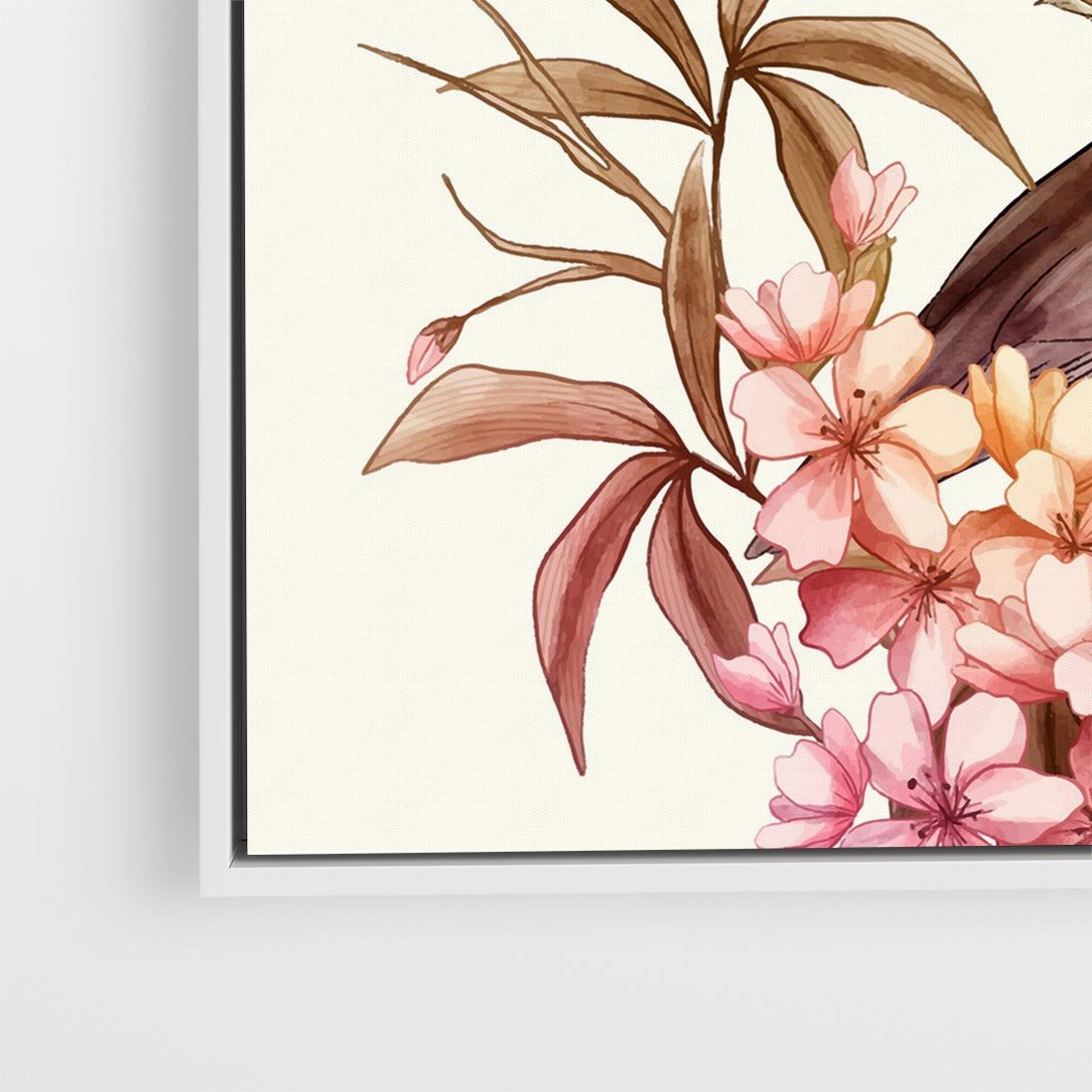 Obraz w ramie 80x80 - Kwiatowe Zanurzenie - japońska sztuka, ptak - rama biała
