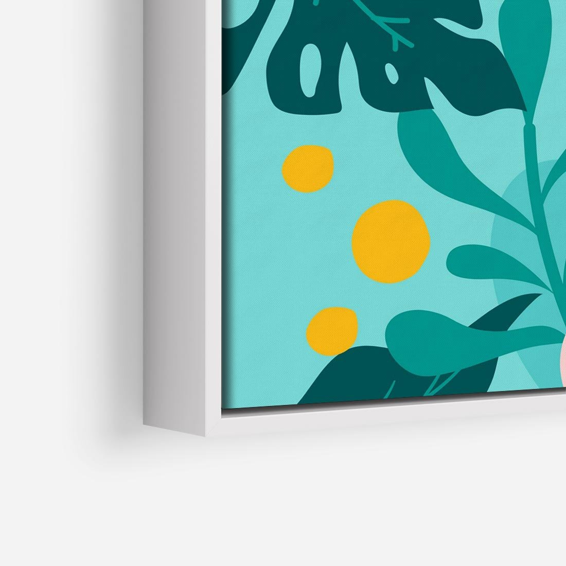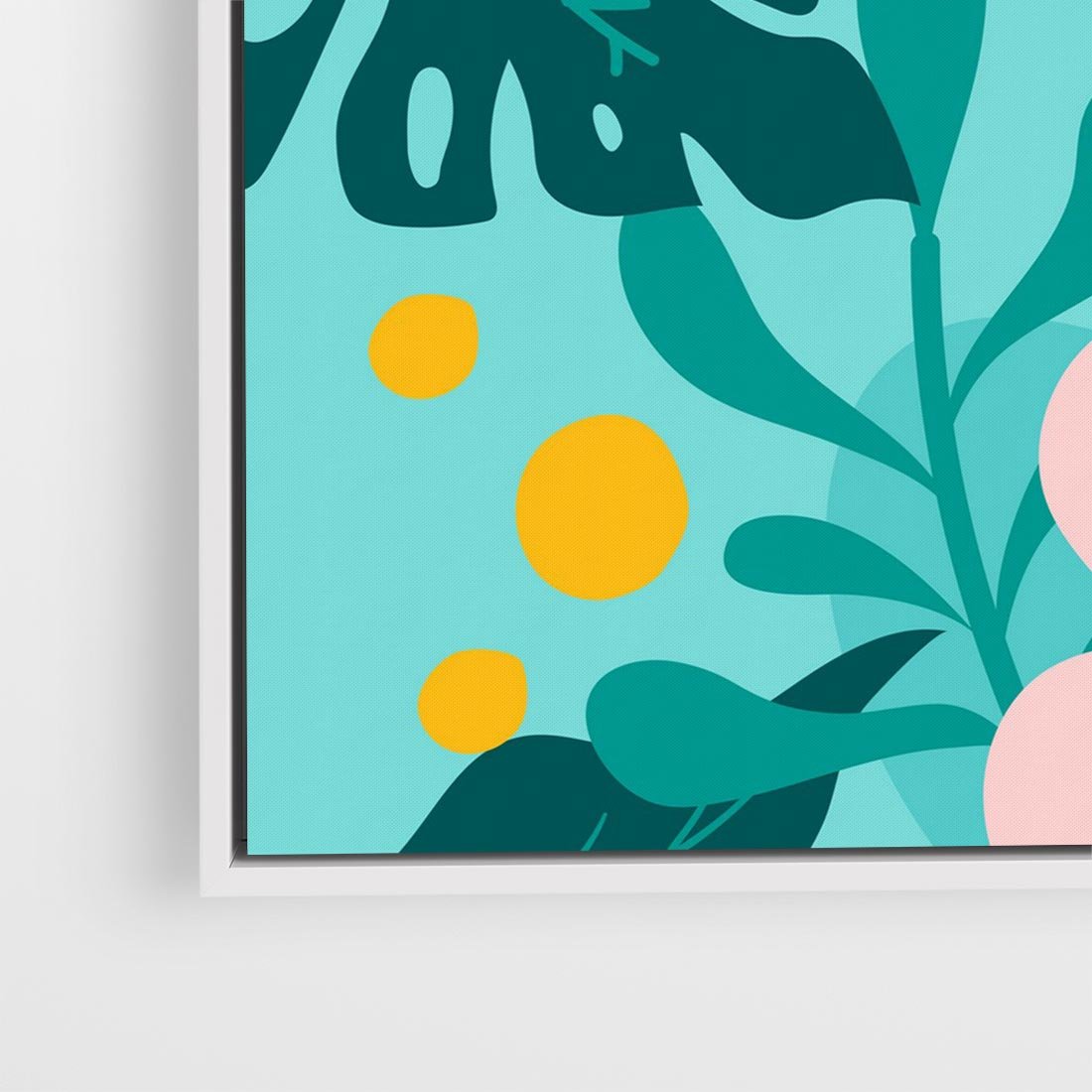 Pastelowa kompozycja wzbogacona kwiatami i tropikalnymi liśćmi w odcieniach turkusu i różu. To artystyczne połączenie natury i delikatności, tworzące harmonijną atmosferę.