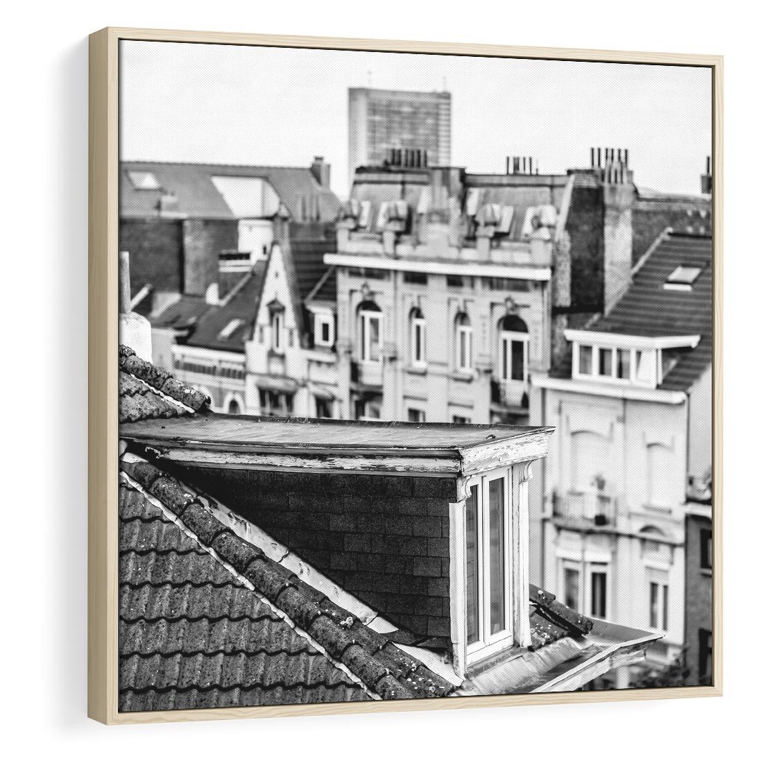 Obraz w ramie 80x80 - Miasto w Retro Odsłonie - fotografia czarno biała, ujęcie na dachy wielkiego miasta - rama drewno