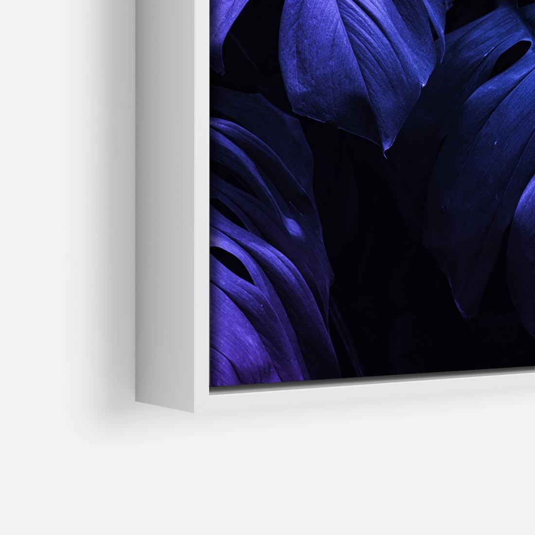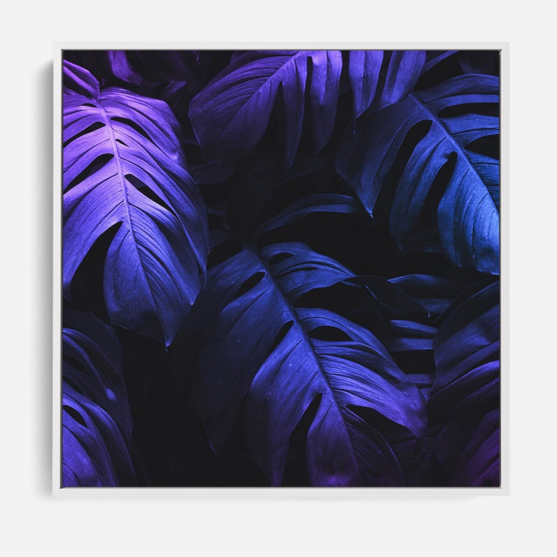 Obraz w ramie 80x80 - Mroczna Magia Dżungli - mroczna grafika, fioletowe liście monstery na czarnym tle - rama biała