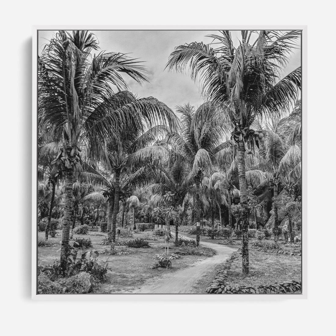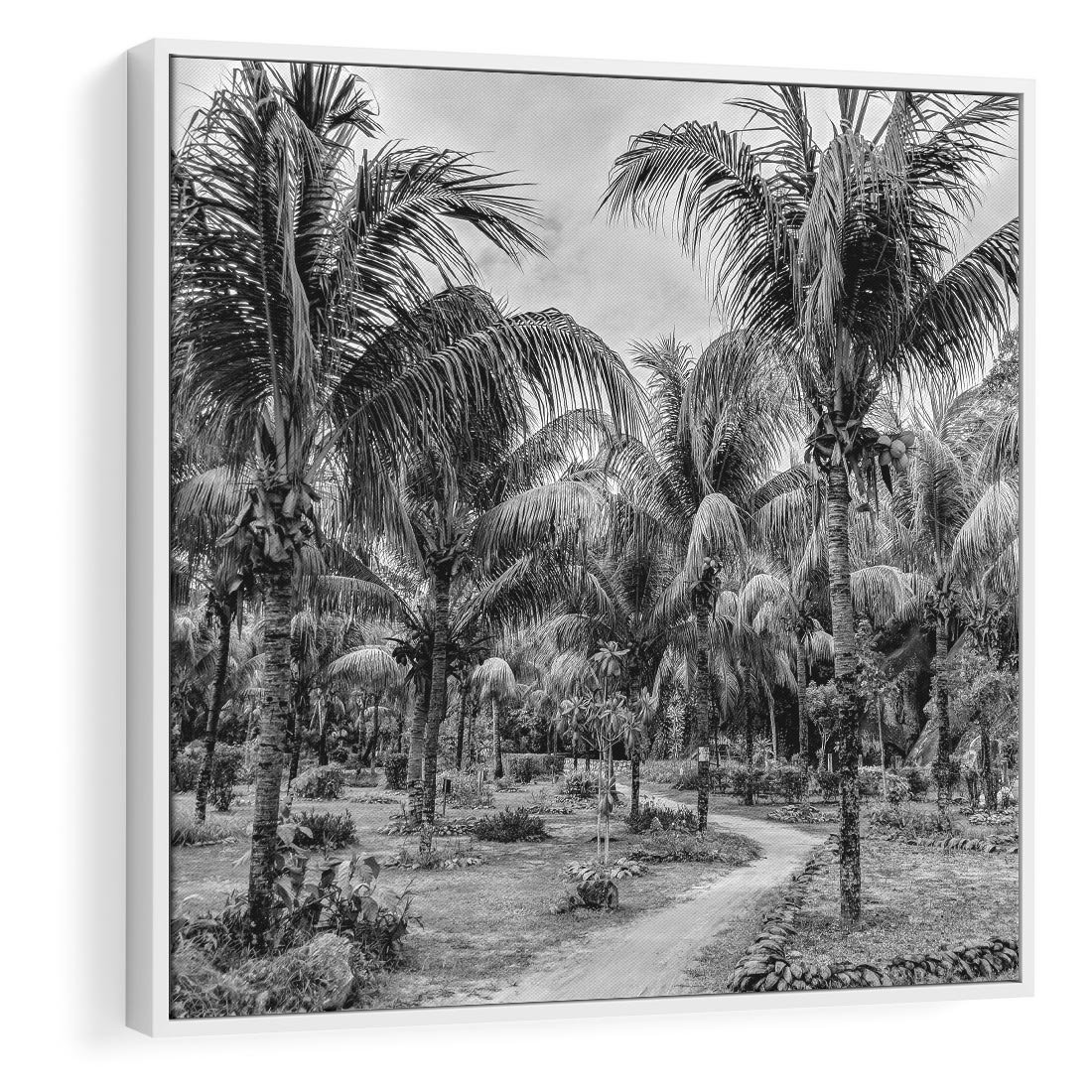 Obraz w ramie 80x80 - Mroczna Ścieżka Tropików - czarno biała fotografia, ścieżka pośród palm - rama biała