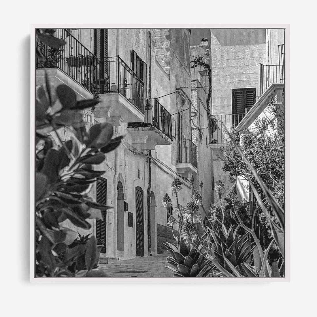 Obraz w ramie 80x80 - Nadmorska Uliczka - czarno białe zdjecie, uliczka w nadmorskim mieście - rama biała