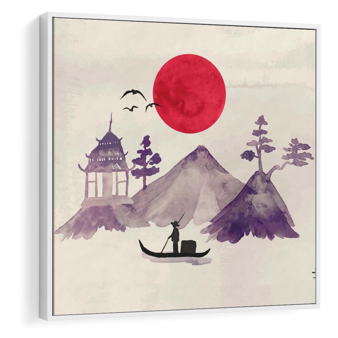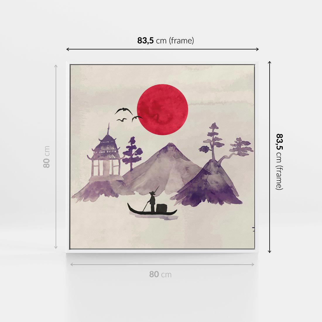 Ta urocza akwarela ukazuje japońską łódź na spokojnym jeziorze, z czerwonym słońcem na horyzoncie. Sztuka emanuje harmonią i spokojem, charakterystycznymi dla japońskiej sztuki. Przenosząc nas w magiczny świat natury, obraz ukazuje urok przyrody i zachodu słońca.