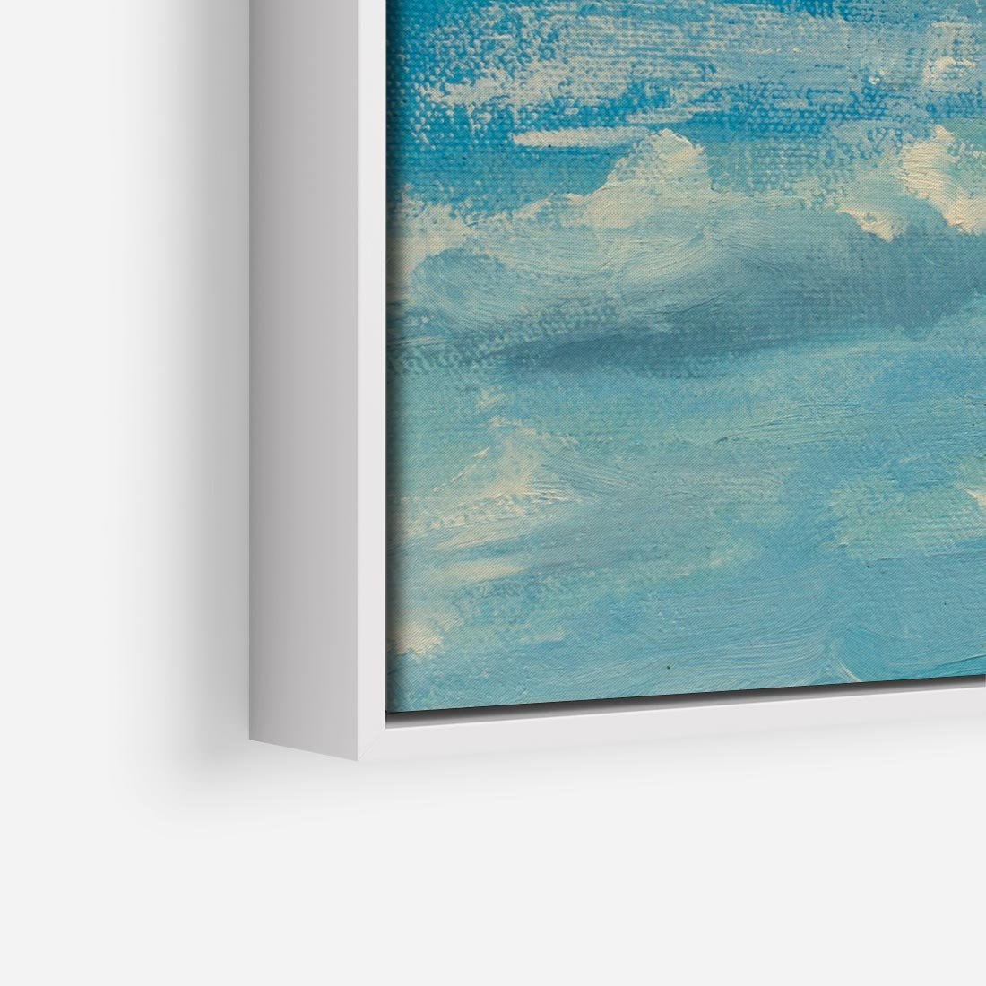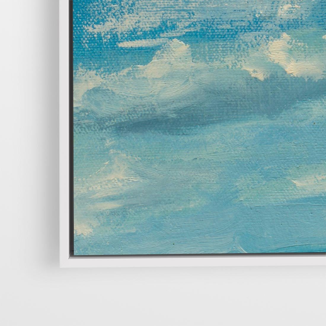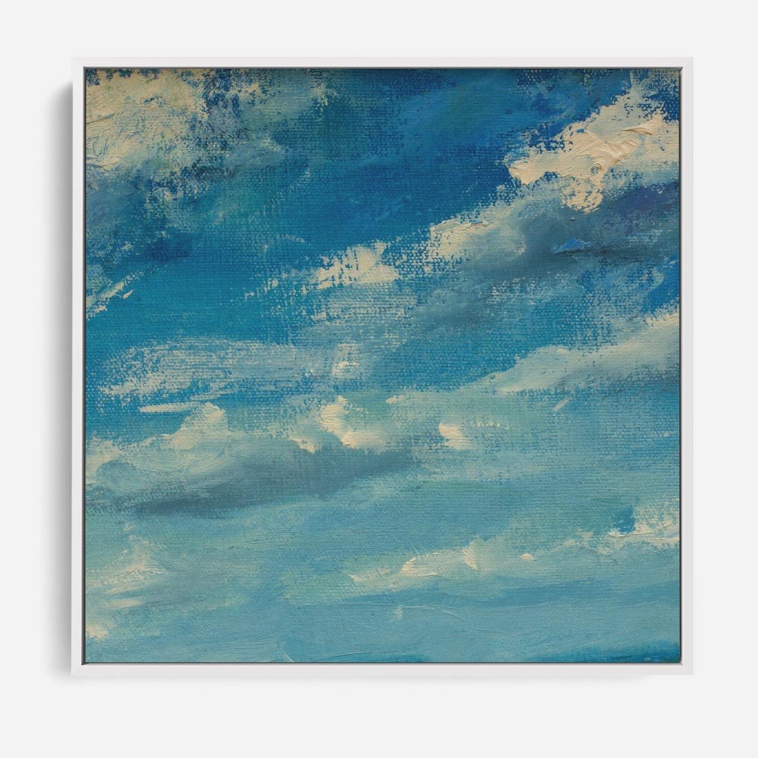Obraz w ramie 80x80 - Oddechy niebiańskiej materii - olejny obraz, smugi farby przypominają obłoki na błękitnym niebie - rama biała