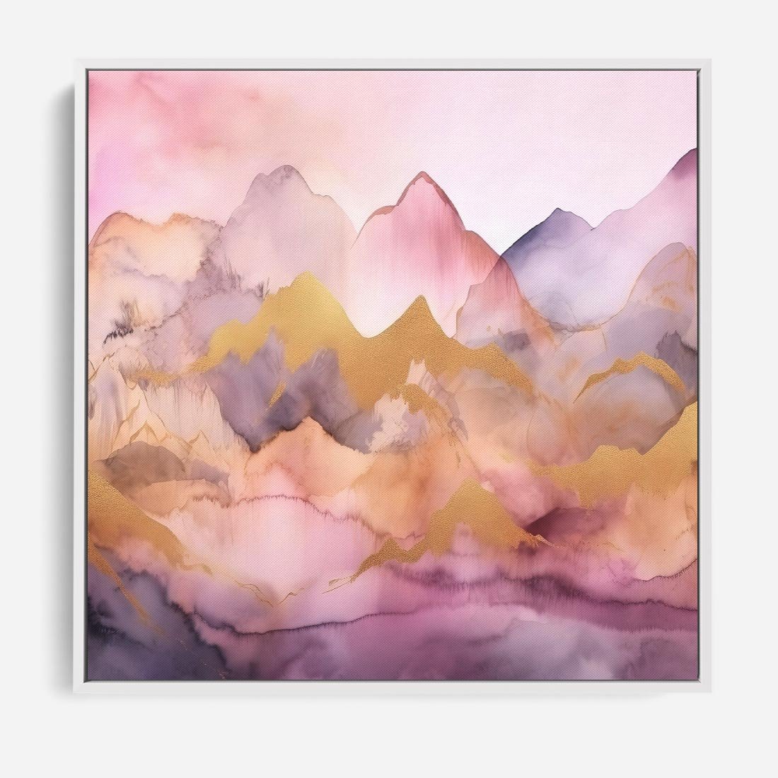 Ten obraz przedstawia pastelowe, różowe góry z akwarelowymi detalami w złotych tonach. Sztuka nowoczesna emanuje spokojem i subtelnością, nadając wnętrzom salonu lub sypialni unikalny urok. Odcienie różu i złota tworzą harmonijną kompozycję, która wzbogaca każdą przestrzeń.
