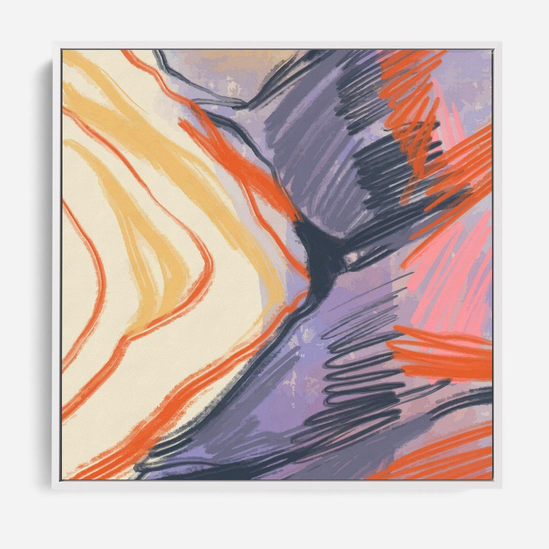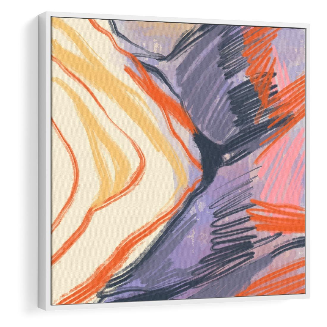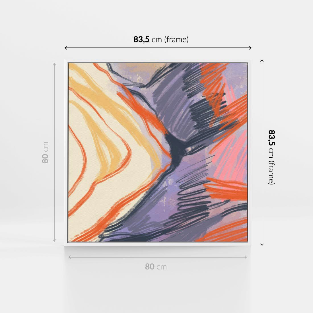 Obraz w ramie 80x80 - Pokreślony Świat - abstrakcyjne formy, odcienie pomarańczu i fioletu - rama biała