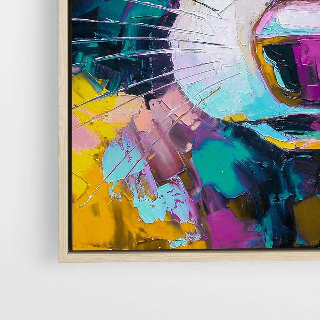 Abstrakcyjne zbliżenie na portret szopa pracza ukazuje zaskakującą paletę kolorów i ruchliwą abstrakcyjną kreskę. To wyjątkowe dzieło emanuje energią i żywiołowością, przyciągając spojrzenia i dodając wyjątkowego uroku każdemu wnętrzu. Odkryj nową perspektywę natury przez soczyste i dynamiczne barwy tego obrazu.