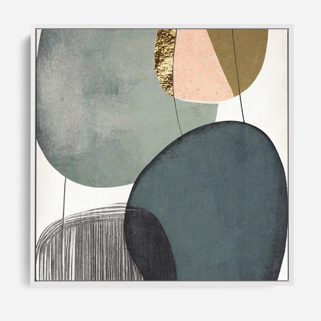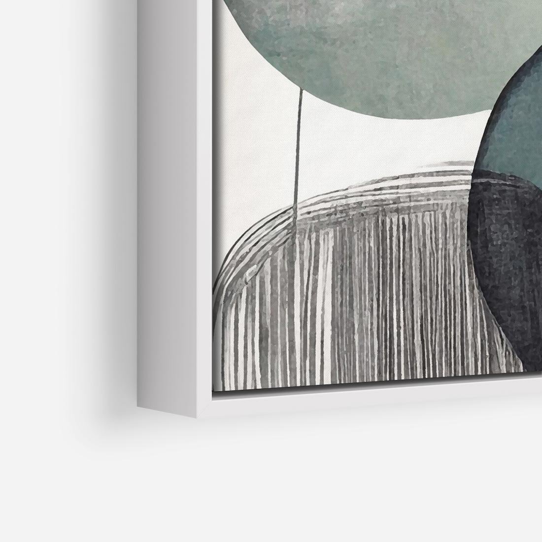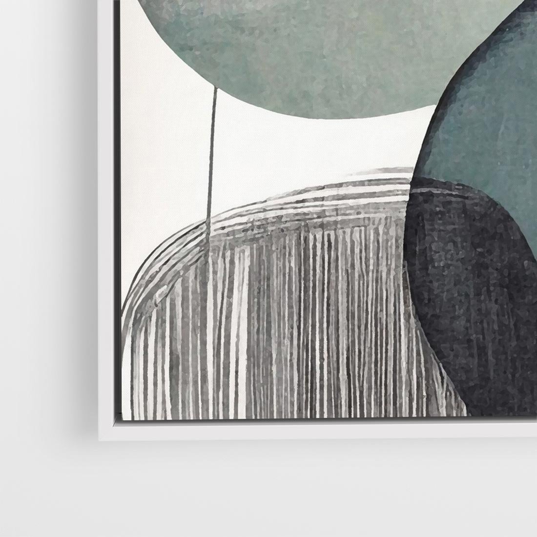 Ten abstrakcyjny obraz to połączenie geometrycznych, obłych form w stonowanych odcieniach szarości i czerni. W minimalistycznym stylu, kompozycja ta emanuje spokojem i nowoczesnością, doskonale wpisując się w różnorodne wnętrza.