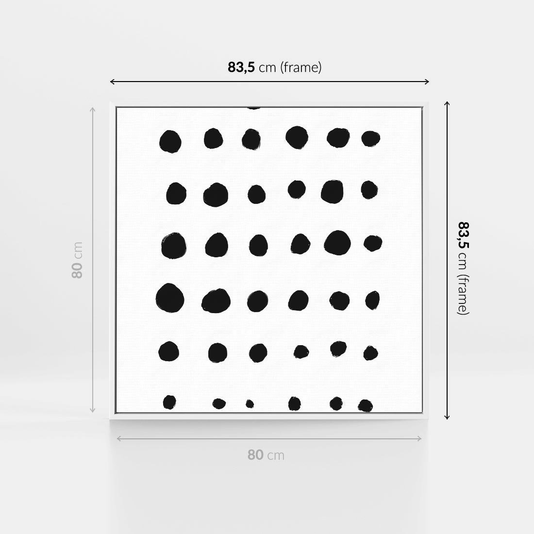 Obraz w ramie 80x80 - Refleksje Światła - minimalistyczna kompozycja, czarne kropkina białym tle - rama biała