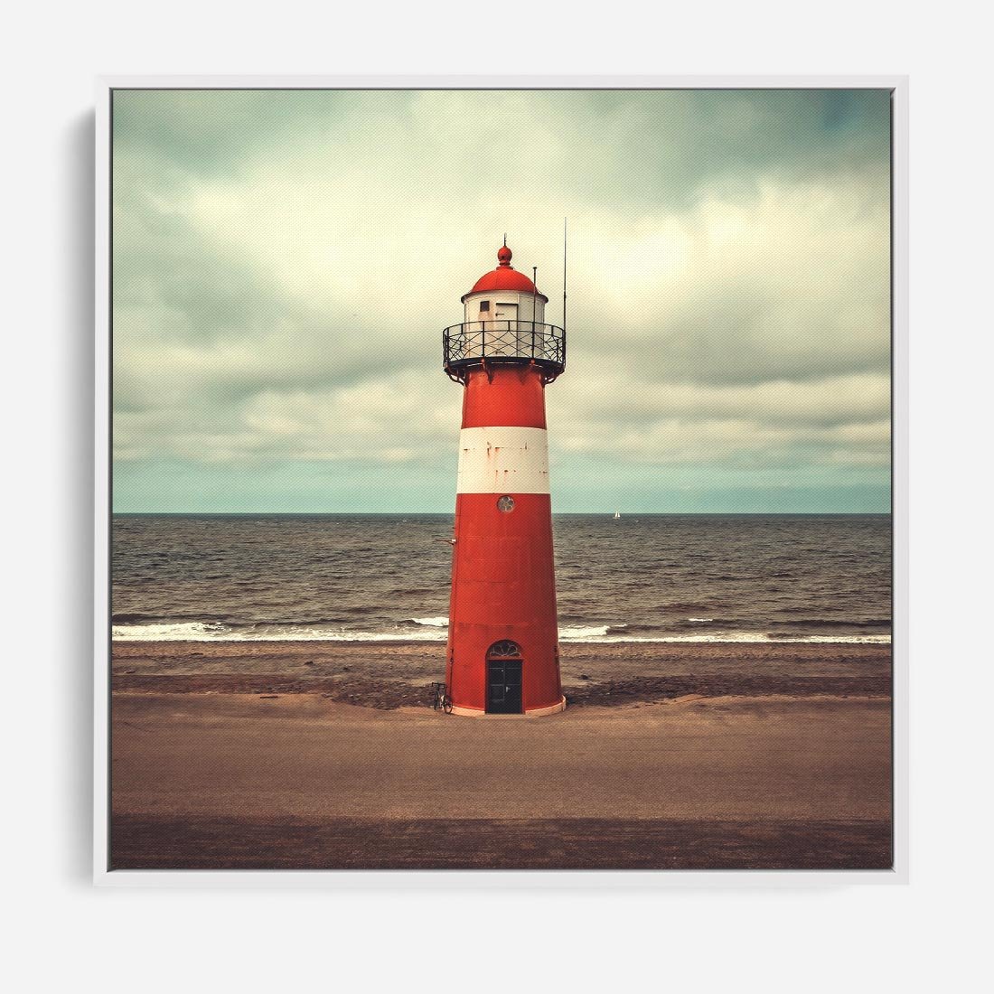 Ta urokliwa fotografia utrzymana w stylu retro przedstawia malowniczą latarnię morską w czerwono-białe pasy. Jej wyrazisty design kontrastuje z zachmurzonym niebem i morzem w tle, nadając kompozycji niepowtarzalny charakter. To klasyczne piękno nadmorskiej scenerii, które przenosi nas w czasie i dodaje nostalgii do współczesności.
