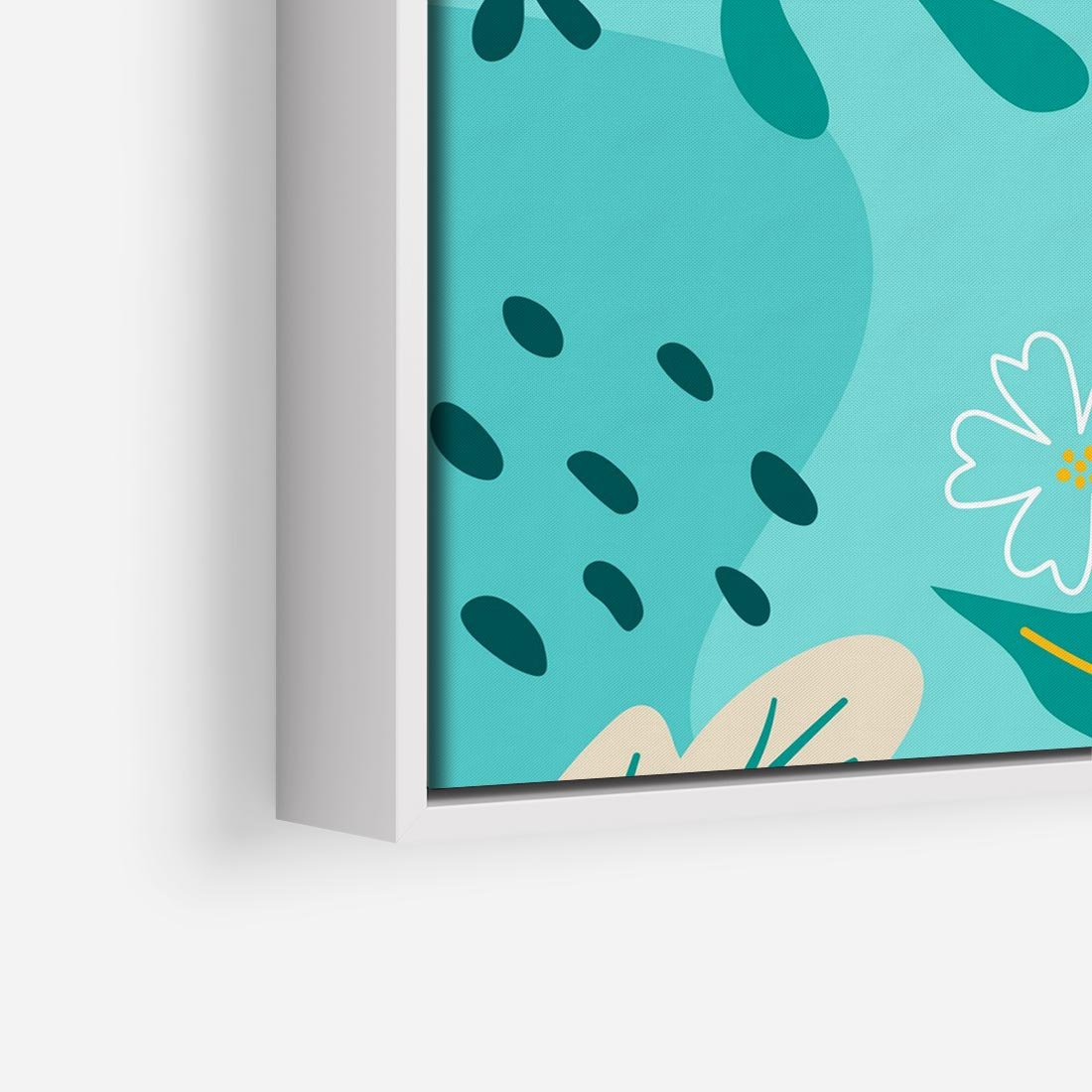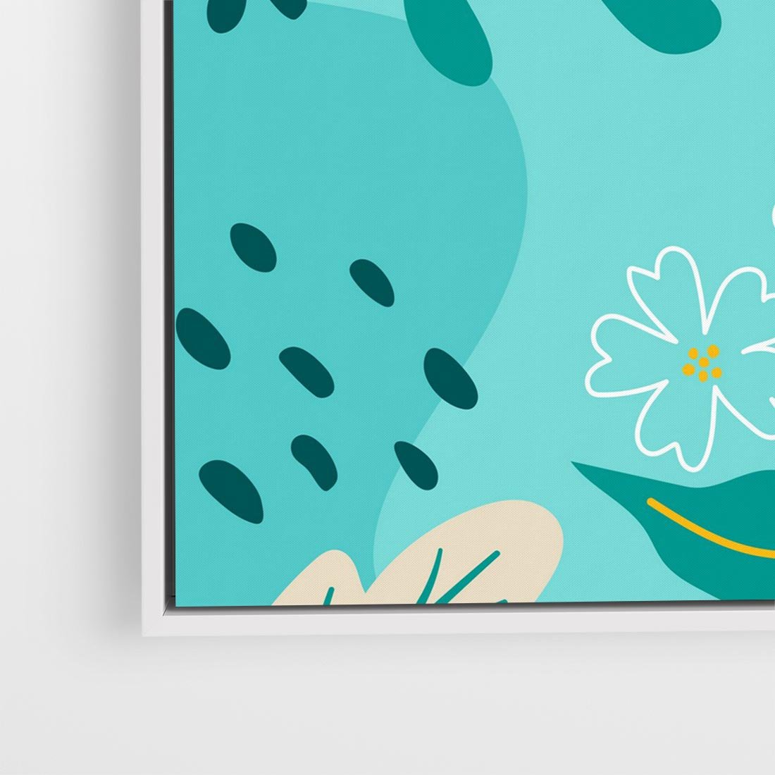 Pastelowa kompozycja ożywiona tropikalnymi kwiatami i liśćmi. Delikatne odcienie turkusu i różu tworzą wizualne radosne piękno, przywołując atmosferę egzotycznej harmonii.