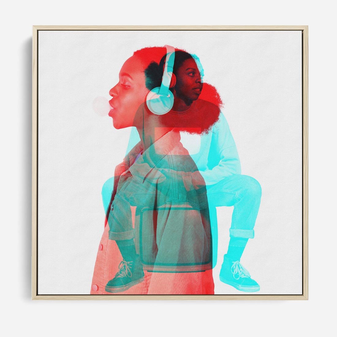 Abstrakcyjny kolaż przedstawiający kobietę w słuchawkach ukazuje fascynujący świat dźwięków i muzyki. To dzieło sztuki oddaje hołd stylowi retro, łącząc barwne zdjęcia w unikalną kompozycję, która ożywa wspomnienia i tworzy nowe emocje.