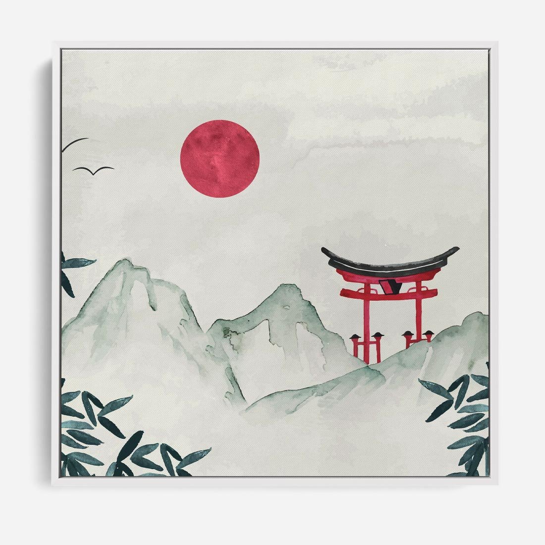 Obraz w ramie 80x80 - Słońce nad Górami - japoński krajobraz, góry - rama biała