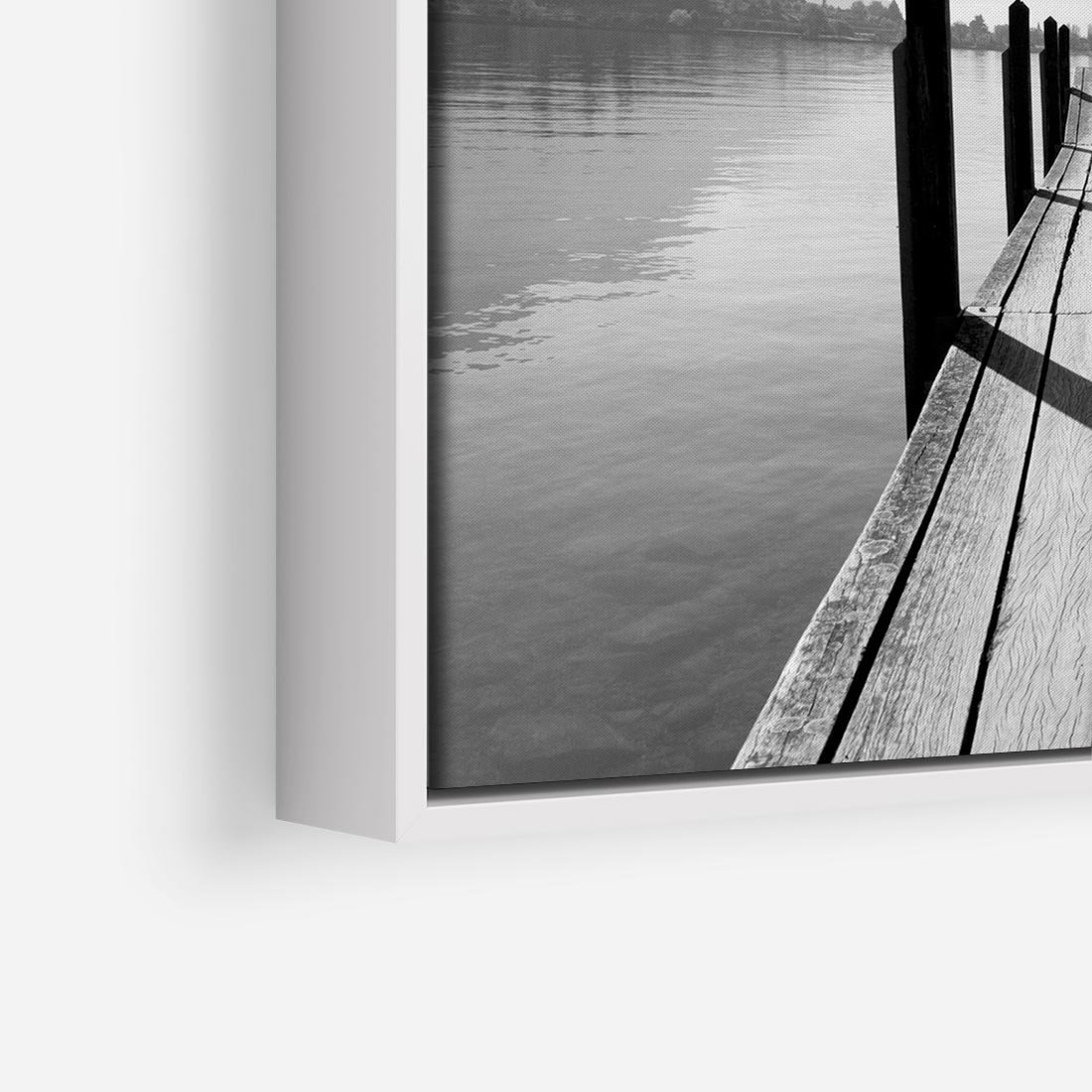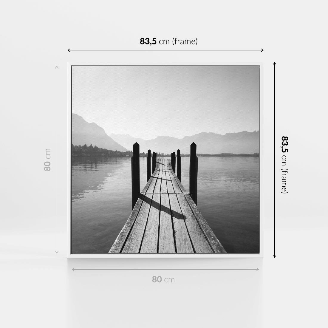 Obraz w ramie 80x80 - Spokojna Przystań - czarno biała fotografia, drewniany pomost na jeziorze - rama biała