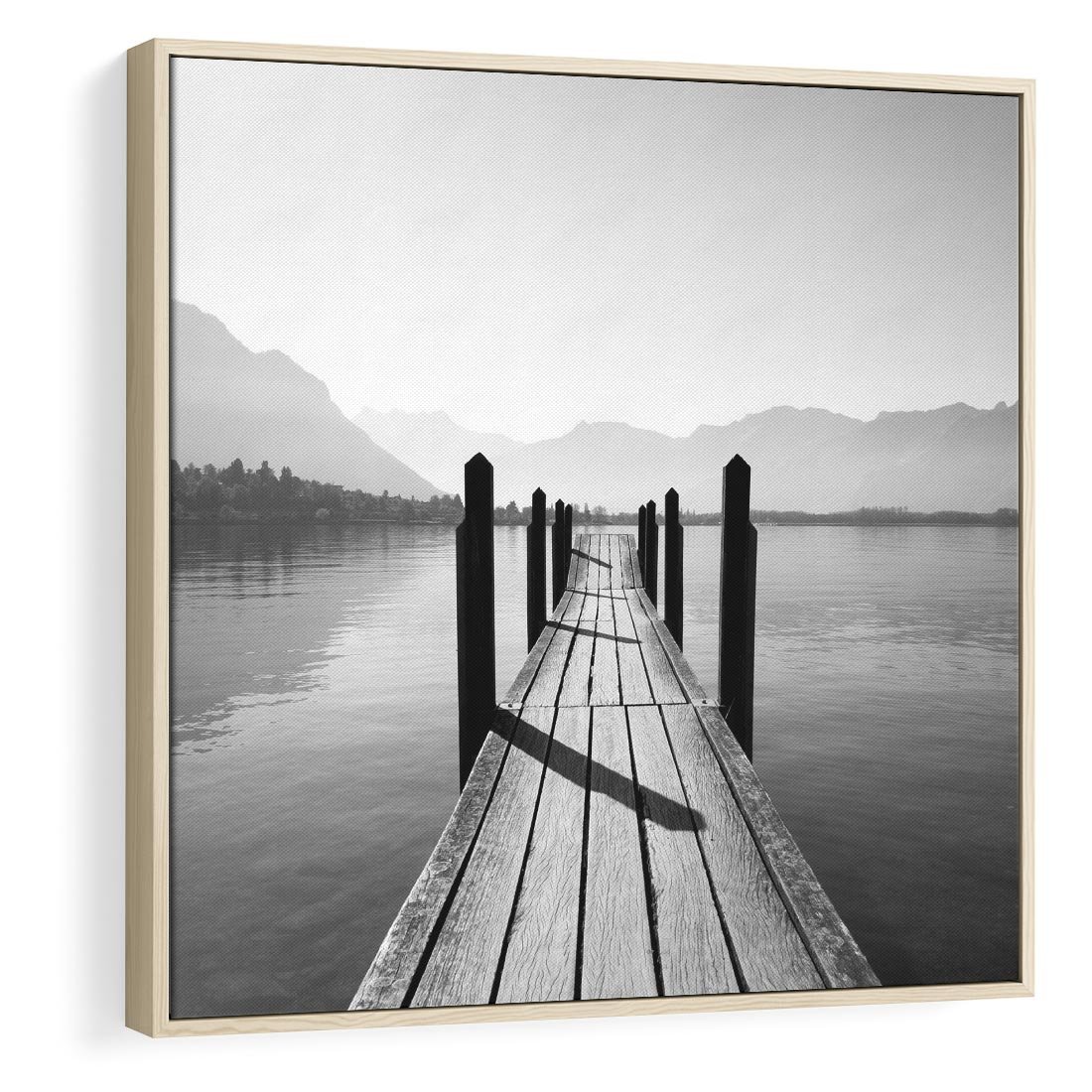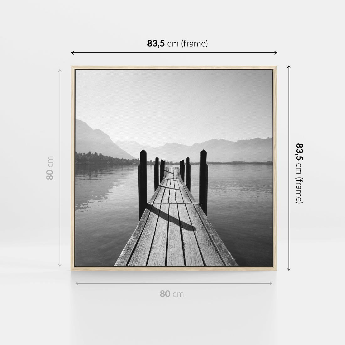 Obraz w ramie 80x80 - Spokojna Przystań - czarno biała fotografia, drewniany pomost na jeziorze - rama drewno