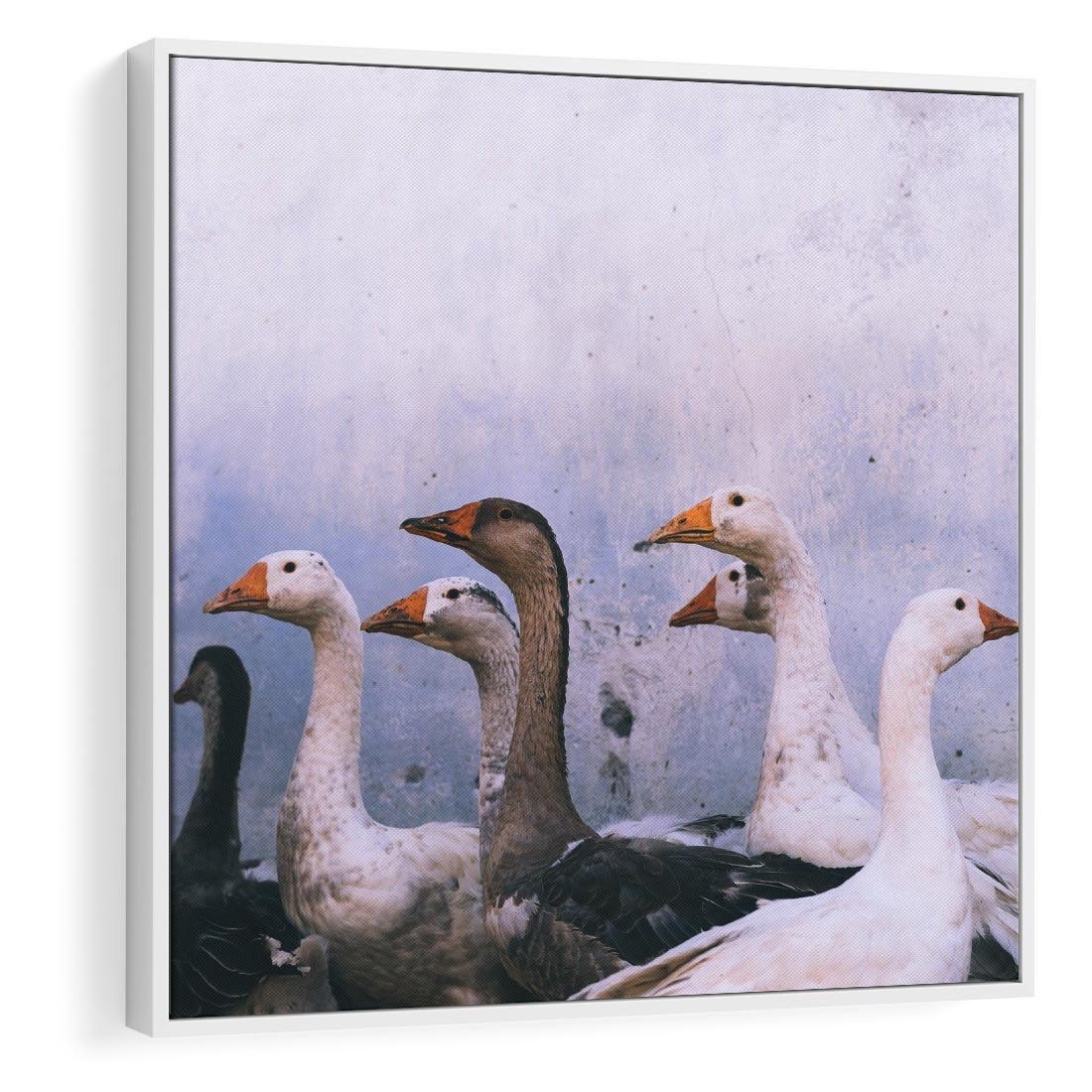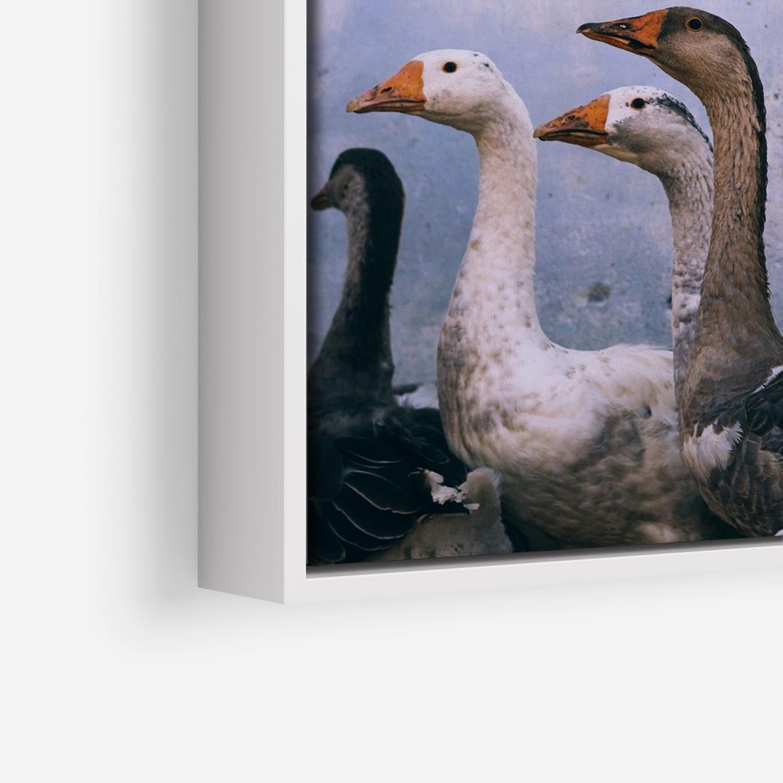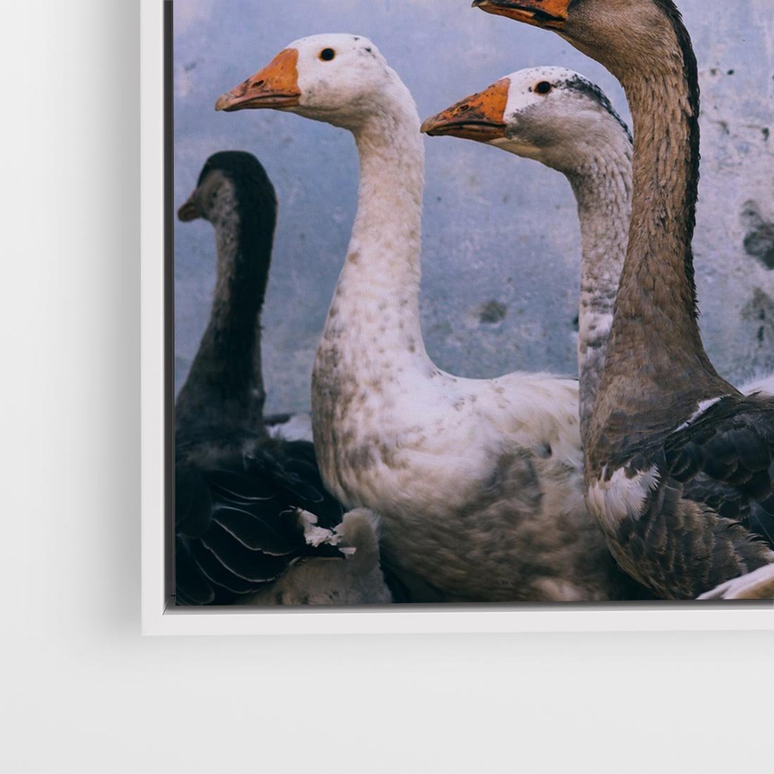 To uchwycony moment prezentujący gęsi w dwóch kontrastujących kolorach - białym i brązowym- na tle ściany. To jednocześnie prostota i głębia, które przenoszą nas w świat harmonii natury i wiejskiego krajobrazu. Obraz zachwyca swoją autentycznością, idealny dla miłośników przyrody i fotografii.