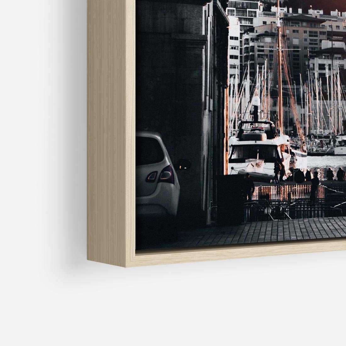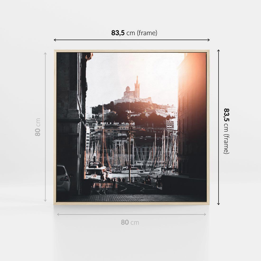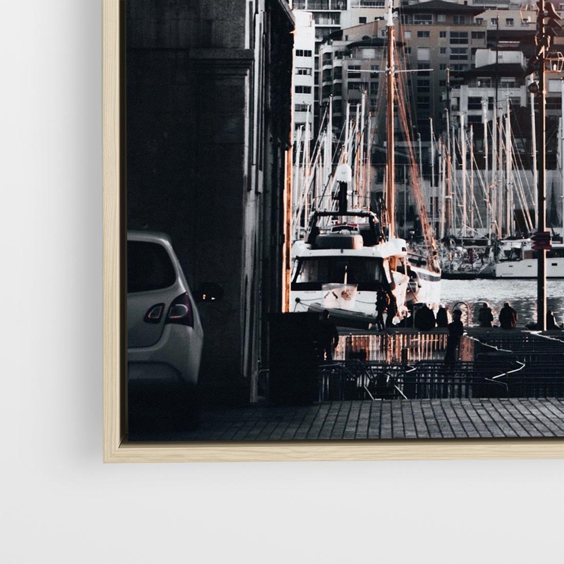 Obraz w ramie 80x80 - Światło Portowe - czarno białe zdjecie, uliczka w nadmorskim mieście - rama drewno
