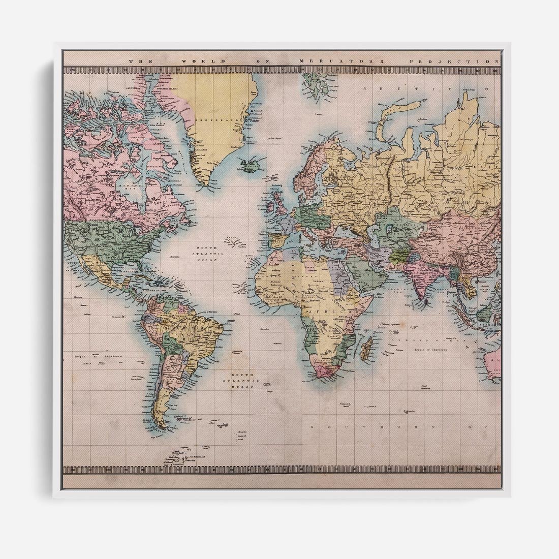 Obraz w ramie 80x80 - Światło Przeszłości - retro mapa świata, mapa - rama biała