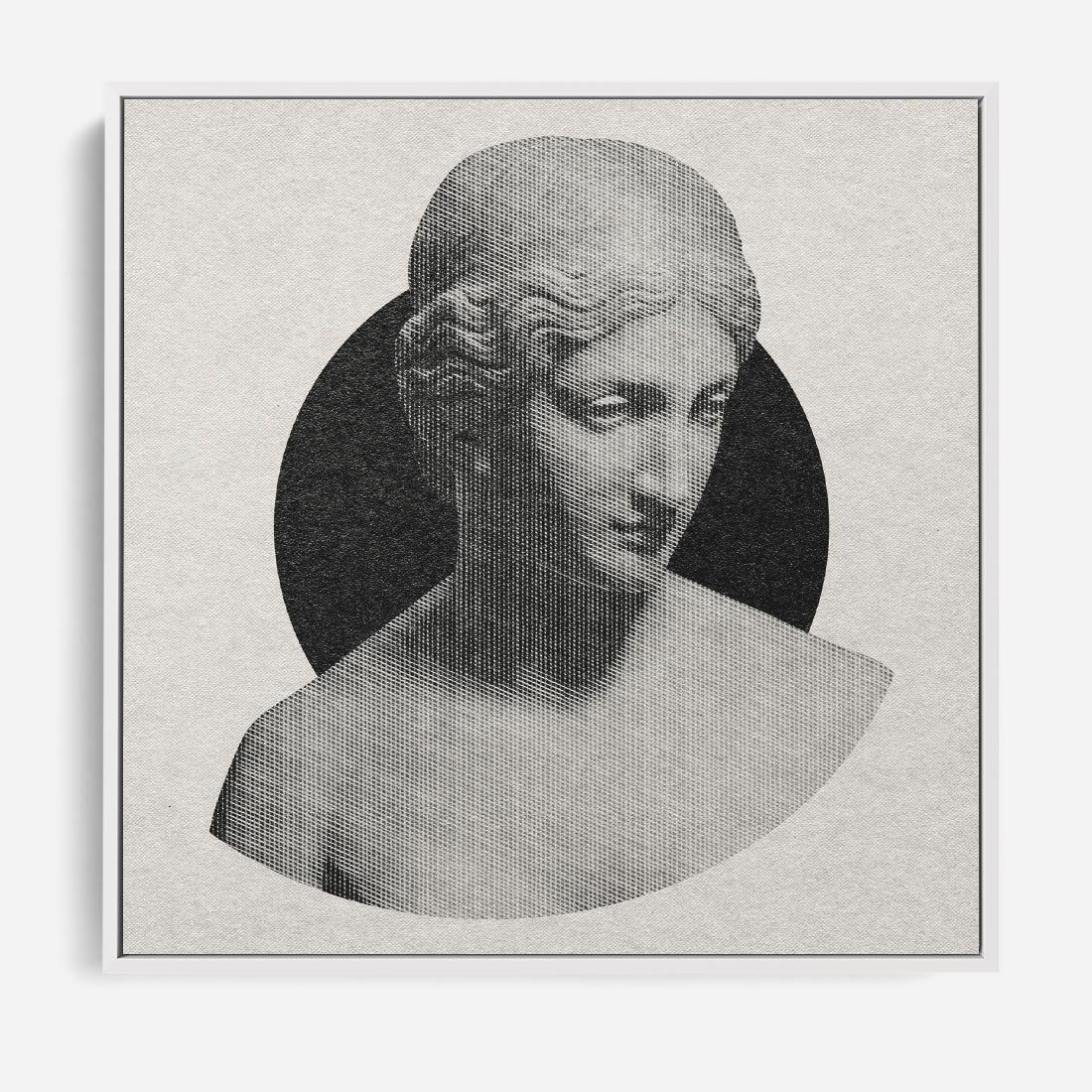 Wybierz ten graficzny kolaż, aby cieszyć się antyczną rzeźbą kobiety w nowoczesnym wydaniu. Czarno-biały obraz dodaje elegancji, a sztuka na płótnie wciąż emanuje magią dawnych czasów.