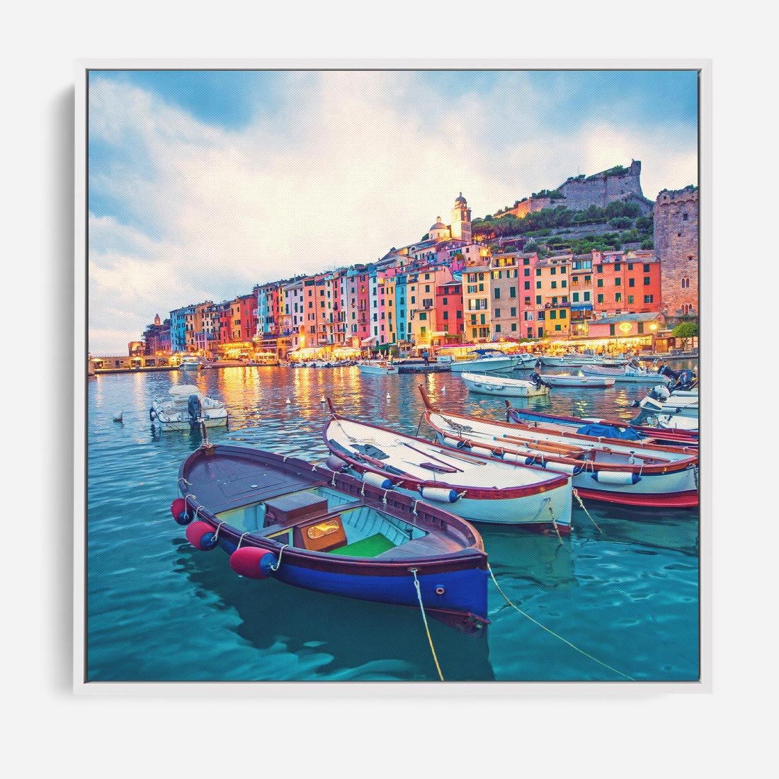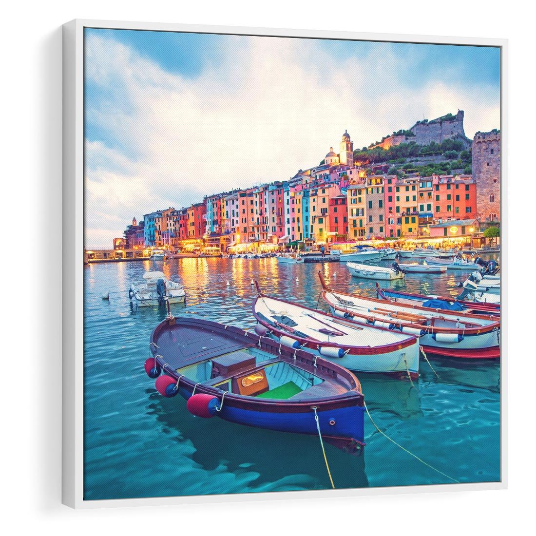 Obraz w ramie 80x80 - Tańczące kolory zachodu - nadmorskie kolorowe miast, kolorowe budynki na brzegu - rama biała