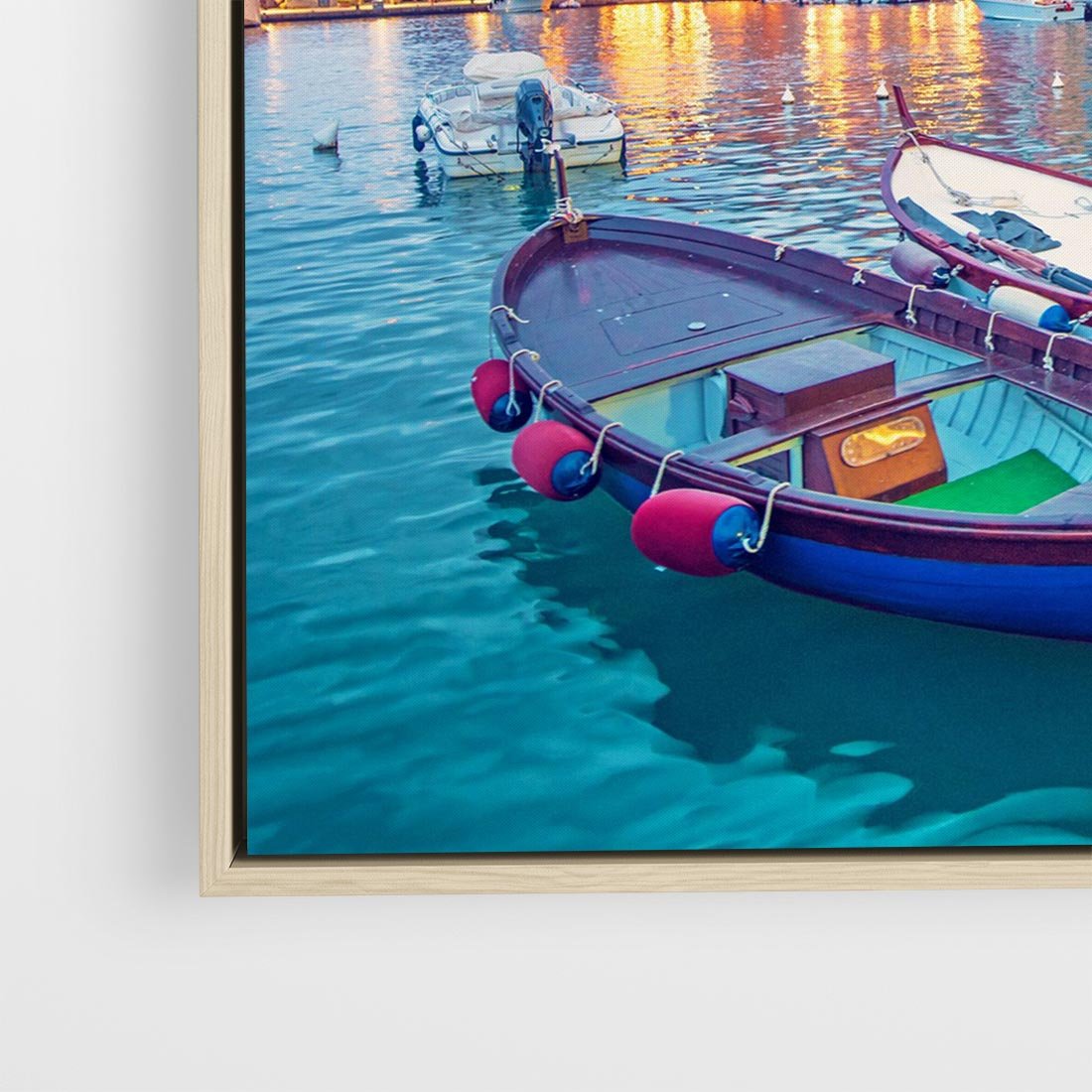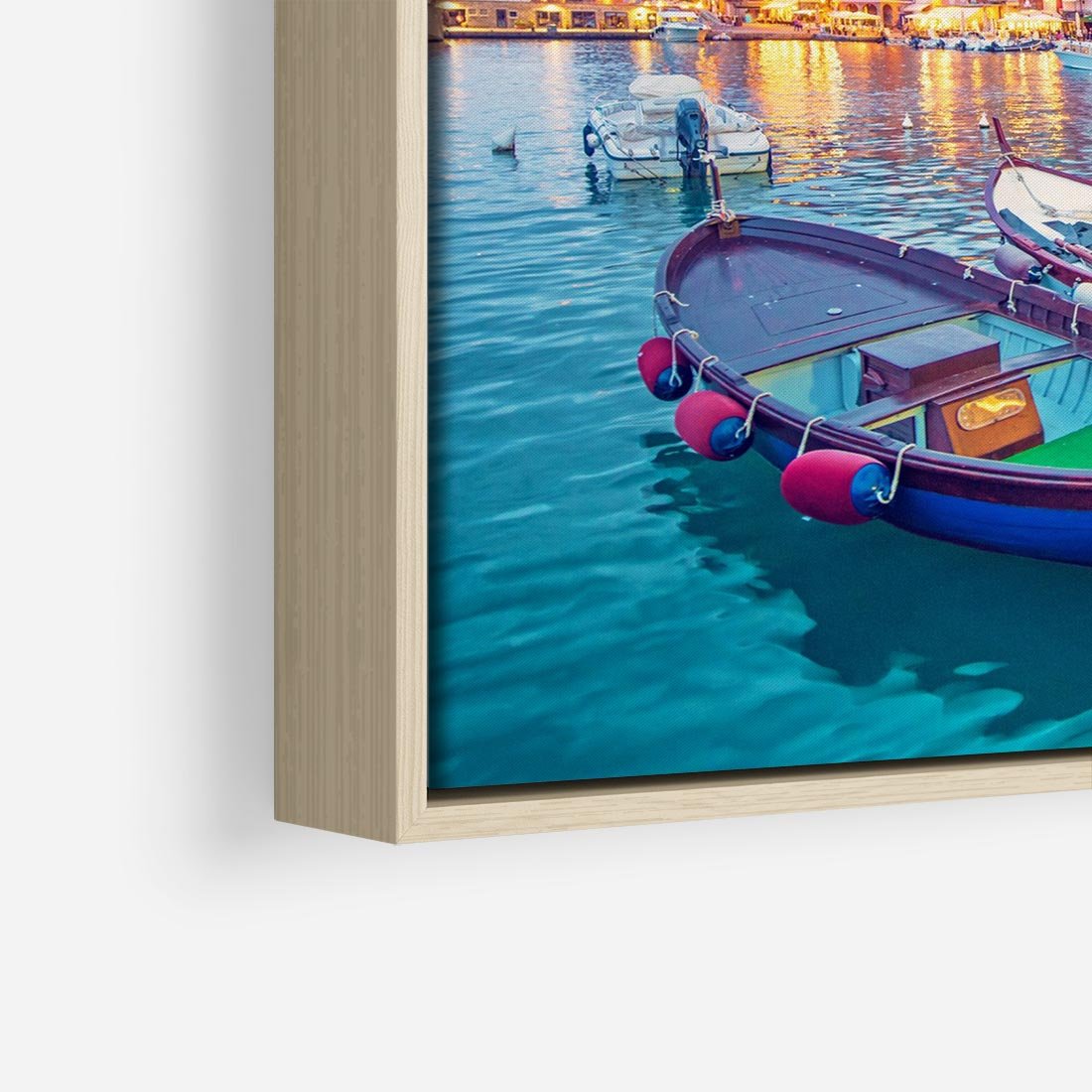 To malowniczy pejzaż przedstawiający nadmorskie miasto ożywione bogatą paletą barw. Budynki w jaskrawych kolorach zdobią brzeg, a port tętni życiem z kolorowymi łodziami. Wieczorne latarnie rozświetlają to idylliczne miejsce, nadając mu romantyczny nastrój. Ten obraz przenosi widza w magiczny krajobraz pełen kolorów i uroku nadmorskiego miasteczka. Idealny dla miłośników podróży i pięknych widoków.