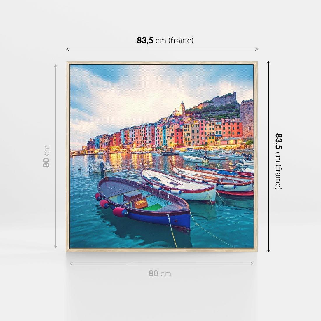 Obraz w ramie 80x80 - Tańczące kolory zachodu - nadmorskie kolorowe miast, kolorowe budynki na brzegu - rama drewno
