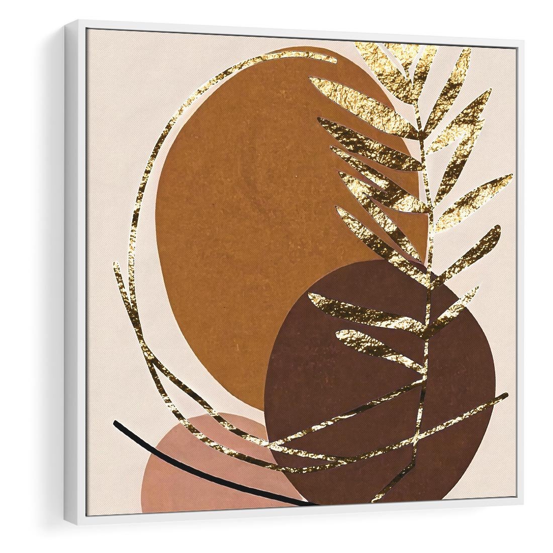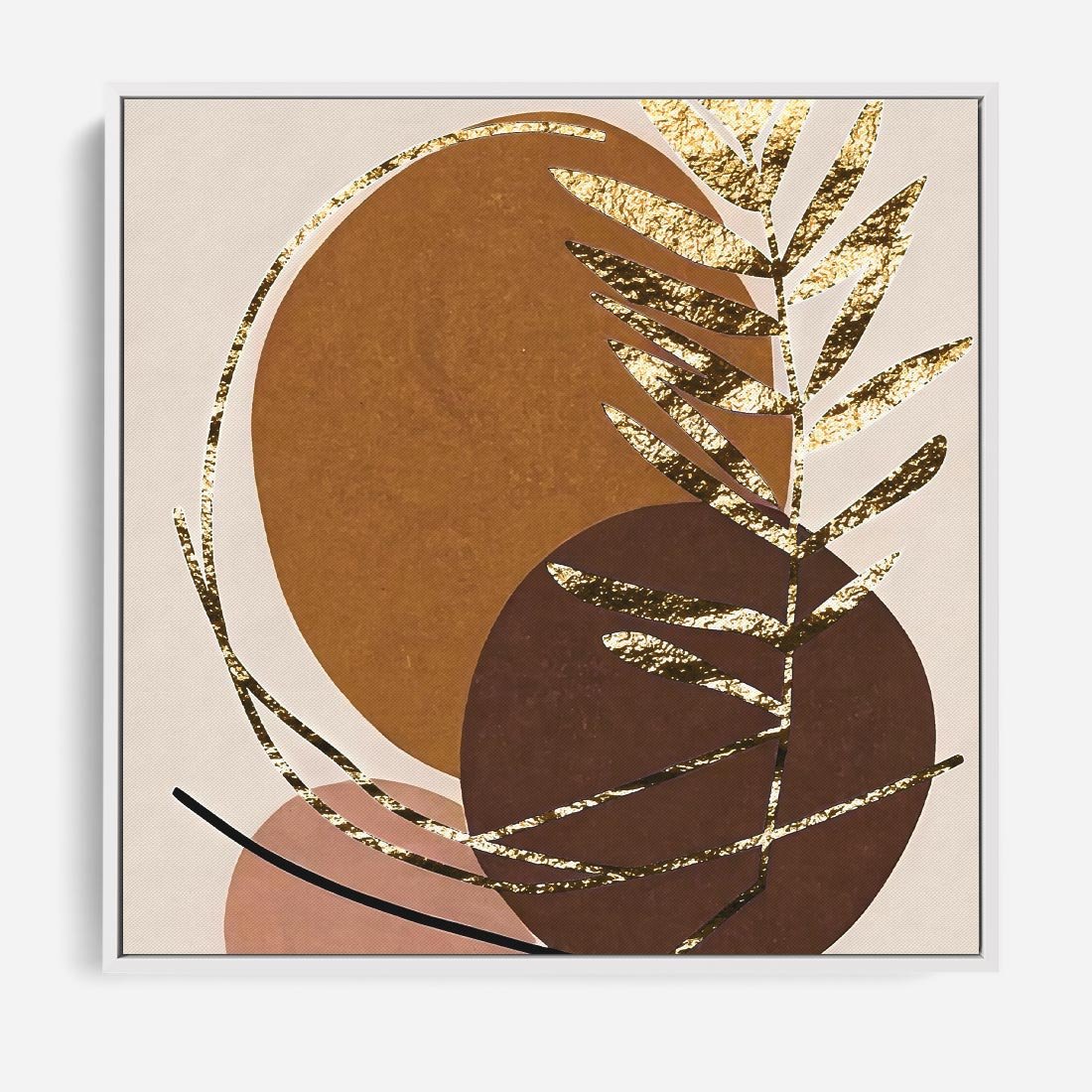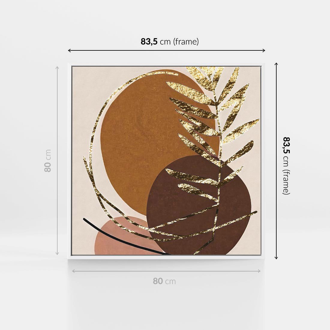 Ten abstrakcyjny obraz to prawdziwe dzieło sztuki, gdzie złote liście palmy kontrastują z geometrycznymi formami w odcieniach brązu. Kompozycja ta tworzy niepowtarzalny efekt, dodając elegancji i nowoczesności wnętrzu. To idealny sposób na dodanie wyjątkowego akcentu do Twojej przestrzeni.