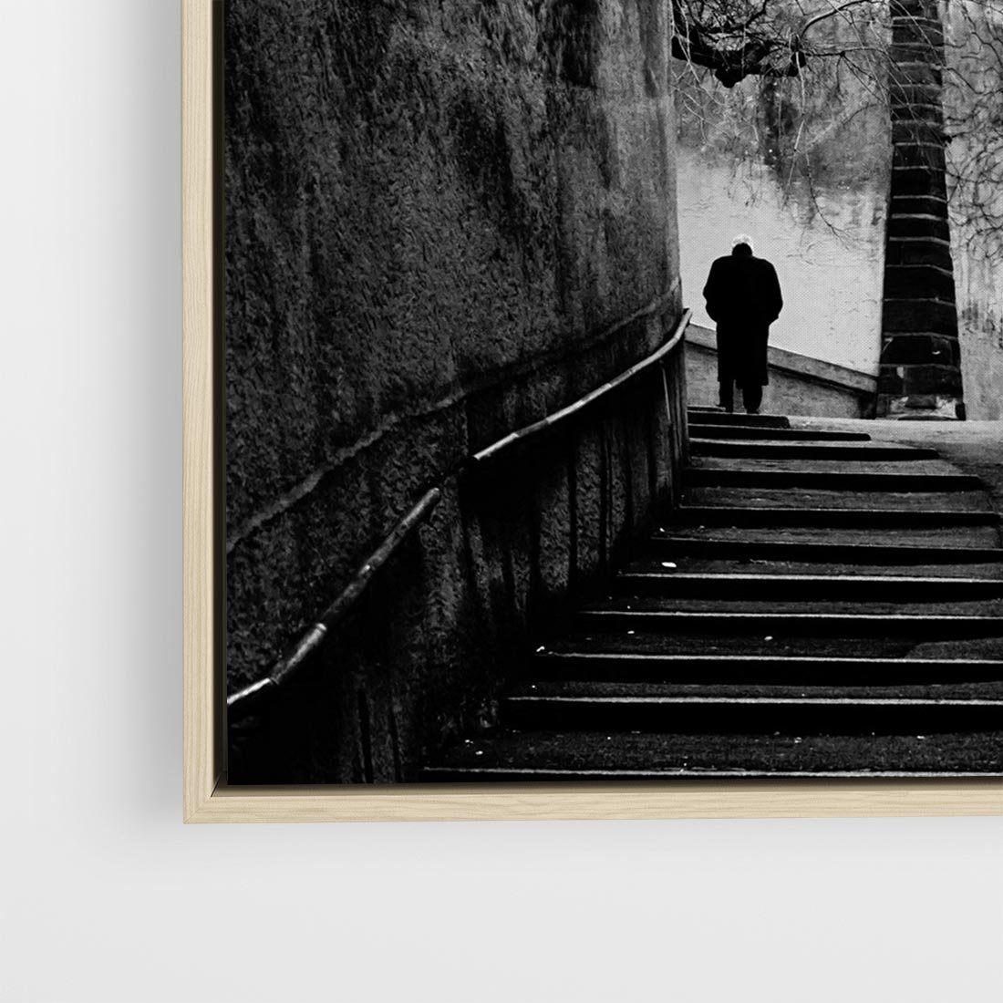 To czarno-białe zdjęcie ukazuje urok uliczki w mieście z widokiem na schody. Kolorystyka monochromatyczna nadaje temu obrazowi elegancji i nostalgii. Schody stanowią centralny element kompozycji, a uliczka w tle dodaje głębi. To zdjęcie może być świetną dekoracją do wnętrza, które podkreśli charakter miejskiego stylu życia lub pasji do fotografii miejskiej.