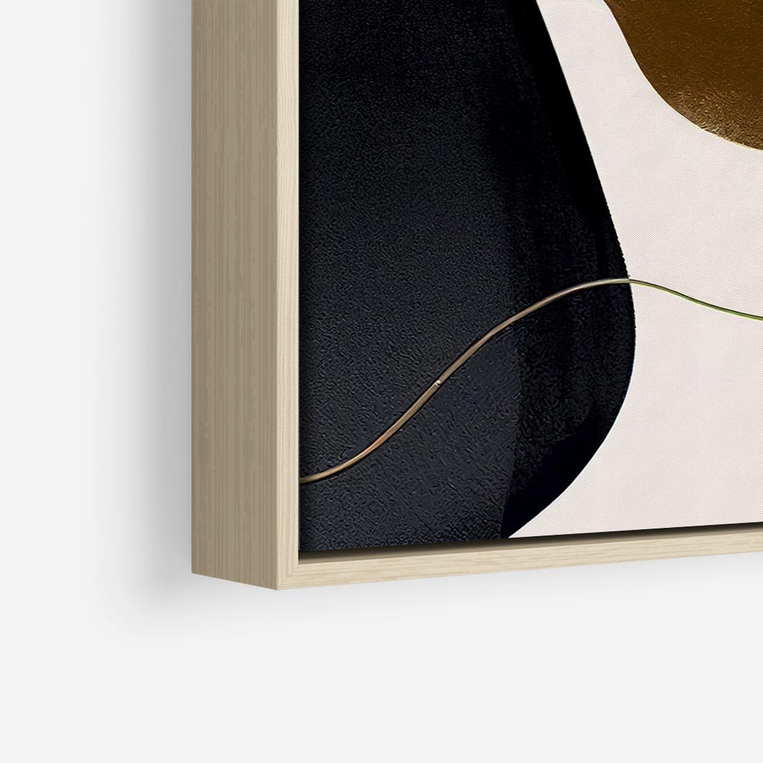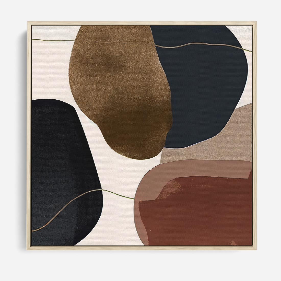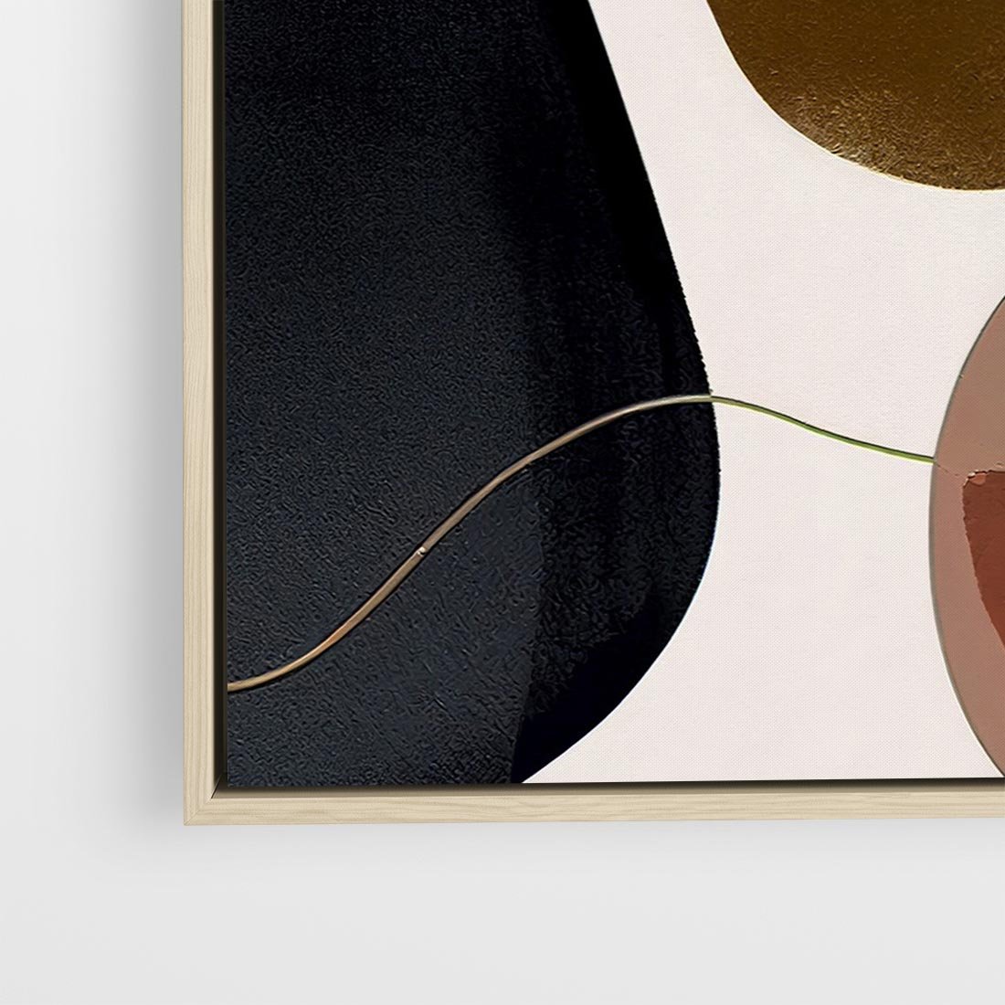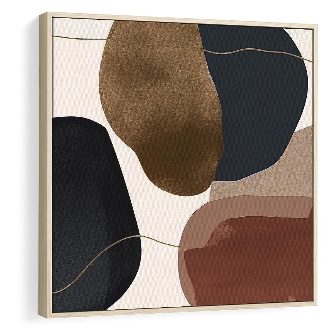 Odkryj abstrakcyjny obraz z nieregularnymi plamami w czarnym, złotym i brązowym na beżowym tle. Złote linie kreski dodają elegancji. Dla miłośników sztuki poszukujących wyjątkowych dzieł do nowoczesnych i klasycznych wnętrz.