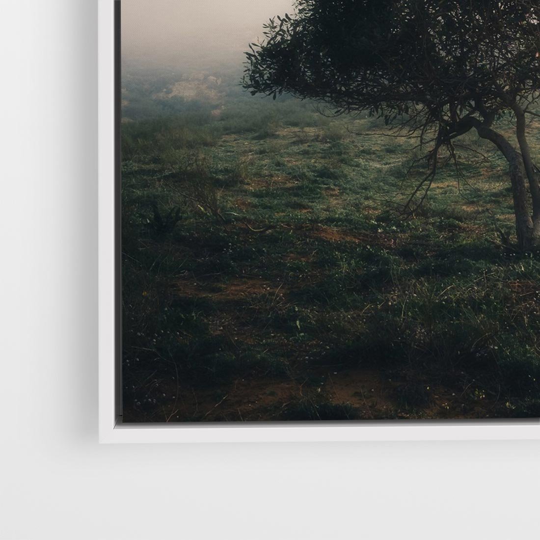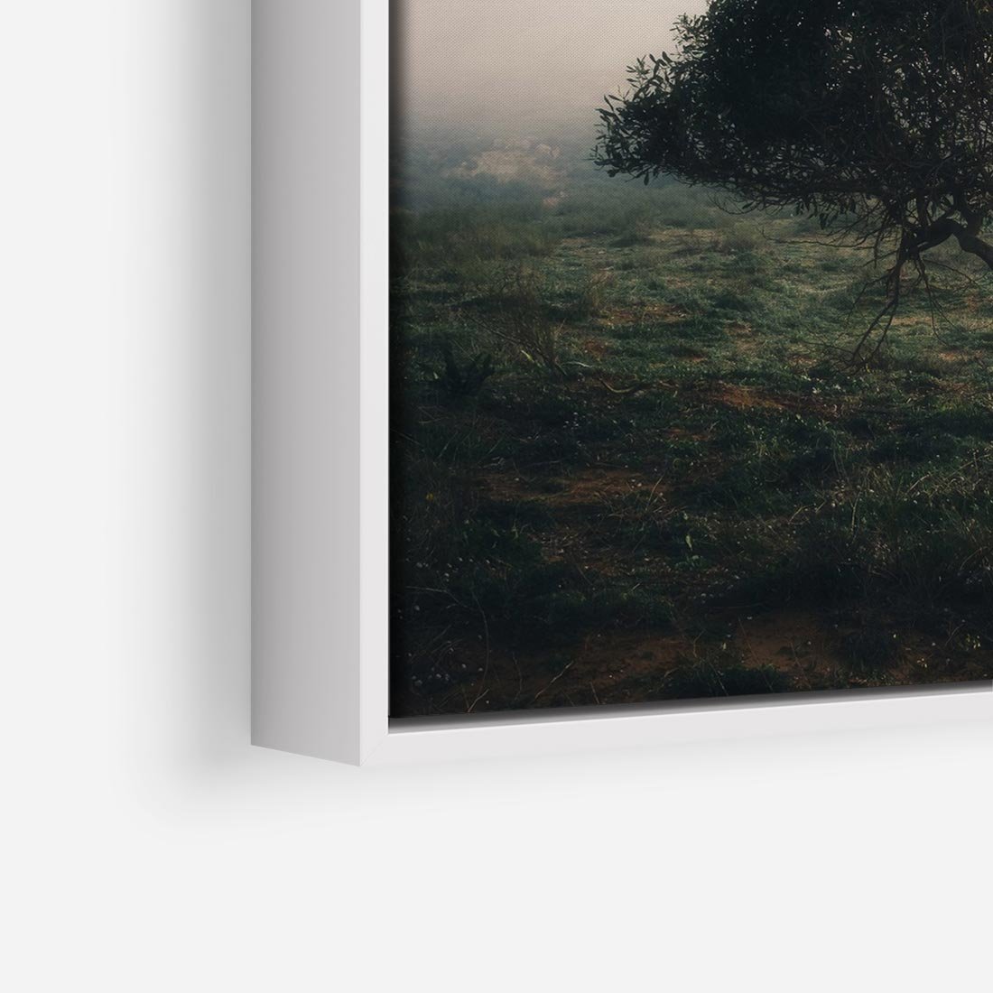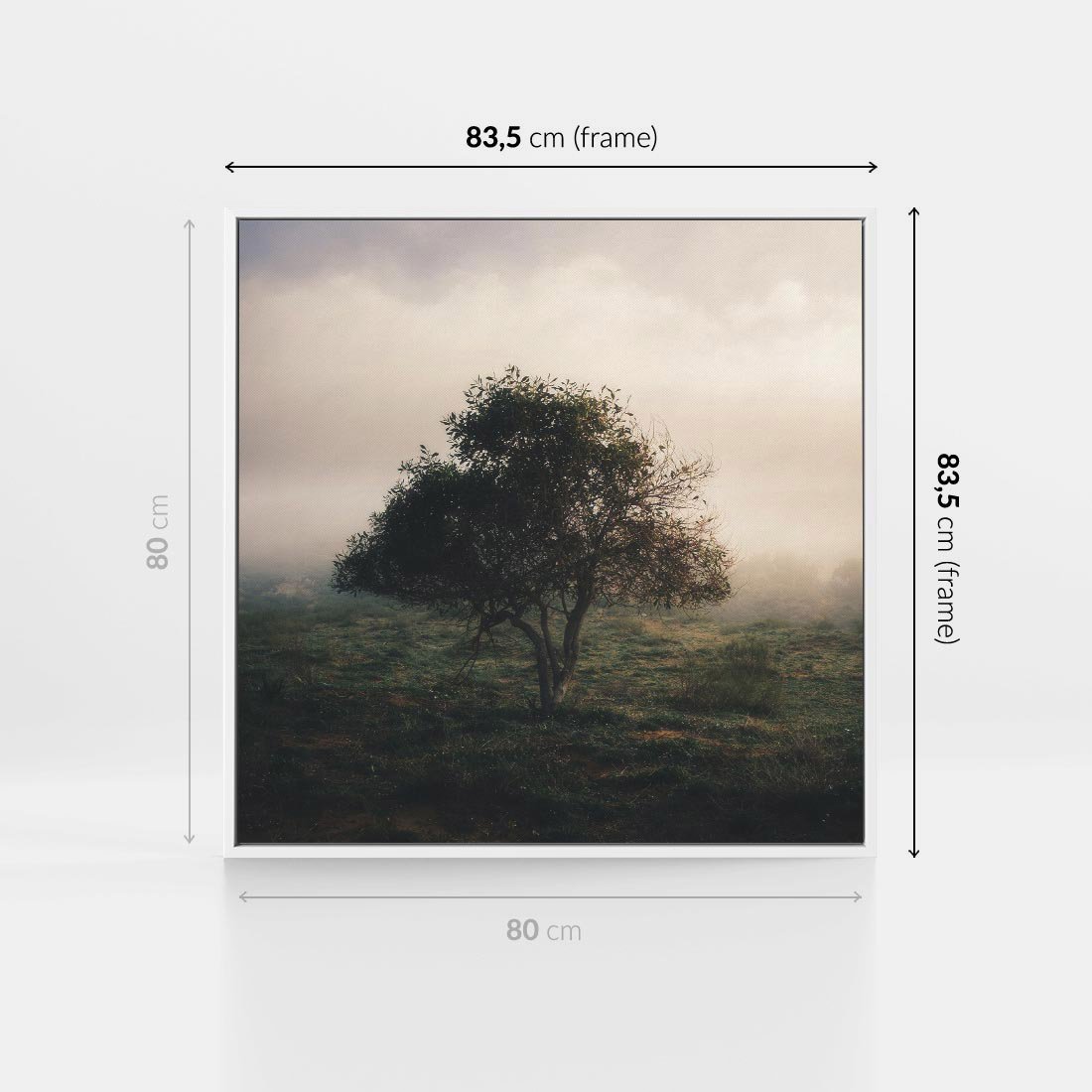 Obraz w ramie 80x80 - Zamglona Prostota - artystyczna fotografia, samotne drzewo na zamglonej łące - rama biała
