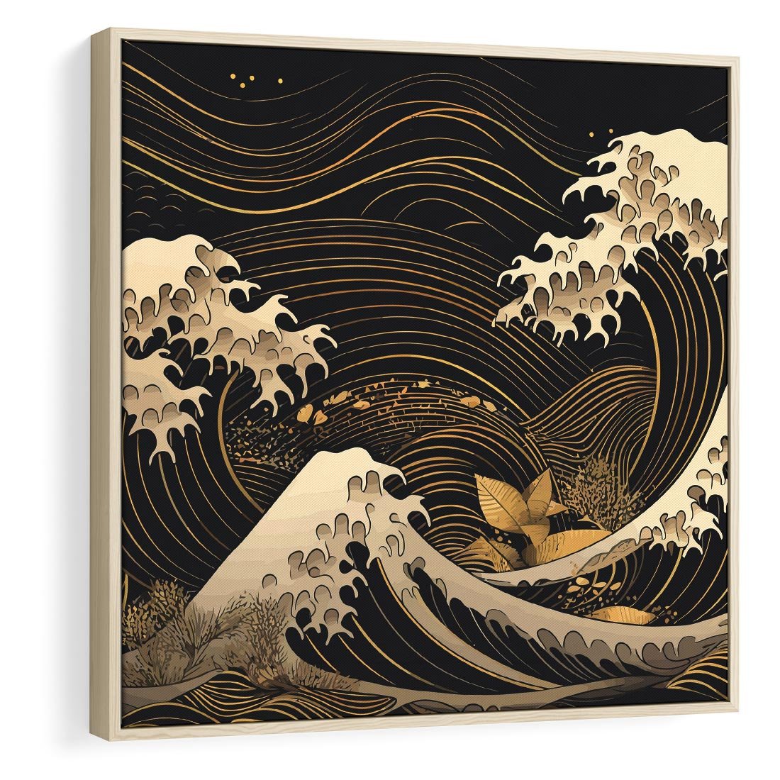 Obraz w ramie 80x80 - Złote Piękno - ciemny obraz, fala morska - rama drewno