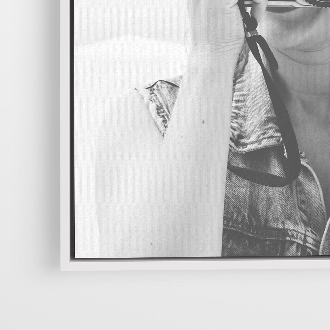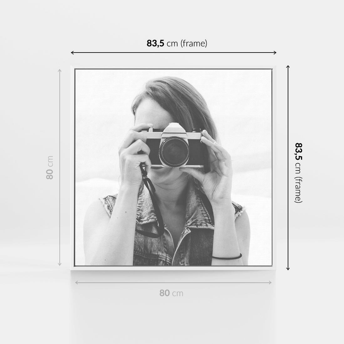 Obraz w ramie 80x80 - Zrób mi Zdjęcie - fotografia, kobieta z aparatem - rama biała