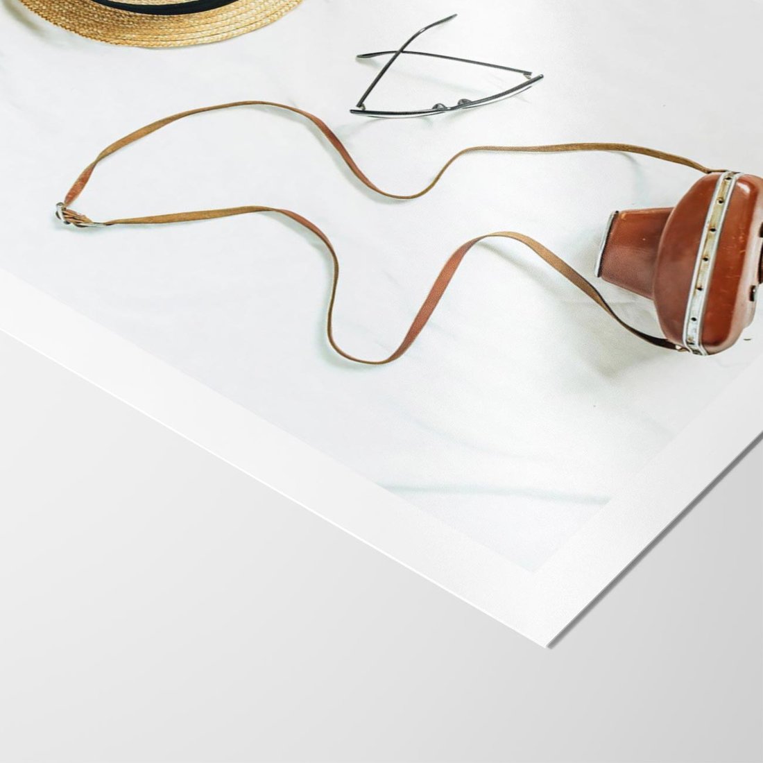 Ta boho kompozycja łączy urok kapelusza słomkowego i aparatu w stylowy sposób, tworząc harmonijną i artystyczną scenerię.